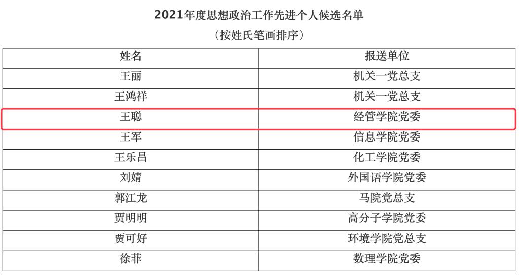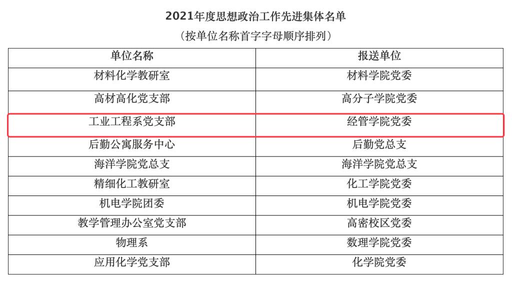 近日,青岛科技大学2021年度思想政治工作先进集体和先进个人评选结果揭晓。根据《关于开展青岛科技大学首届思想政治工作先进集体和先进个人评选的通知》(青科大党字〔2018〕94号)精神,我院工业工程系党支部获评“2021年度思想政治工作先进集体”,王聪老师获评“2021年度思想政治工作先进个人”称号。