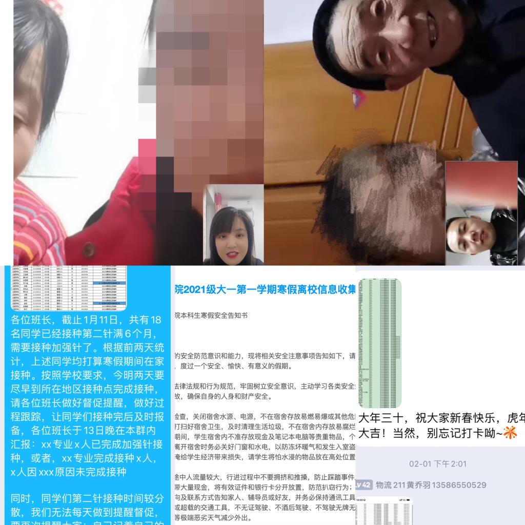 寒假走访规定开展“云端”走访工作,深入走访2名困难学生,并与学生、家长就学校政策、学生在校情况等开展良性互动,培育家校共育良好氛围。关注心理健康动态,利用年级QQ群、专业微信群、微信公众号等开展心理健康知识宣传,密切关注学生网络思想动态,并适时做好挂科学生、家庭困难学生、心理危机学生的心理困境纾解,助力学生度过平安充实的假期。