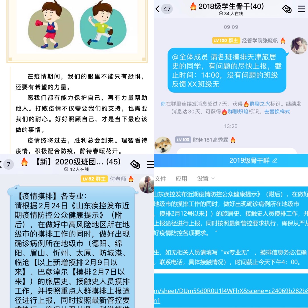 、年级、班级、宿舍”四级防控主体体系,织牢织密“网格化”疫情防控网。辅导员、班主任(导师)全方位联动,全面摸排、动态掌握寒假期间全体学生及共同生活的家庭成员健康状况和行程轨迹,确保每名学生返校前14天的旅居史、接触史、健康史底数清、情况明。及时根据学校通知做好重点地区疫情摸排工作并按照最新管控要求执行,确保从严从紧、科学精准落实好疫情防控各项要求。积极引导全体学生在“青科学工”平台进行累计连续14天健康打卡,如实、主动向辅导员报告健康状况和活动轨迹。通过线上主题班会、发布线上提醒、德州扑克俱乐部