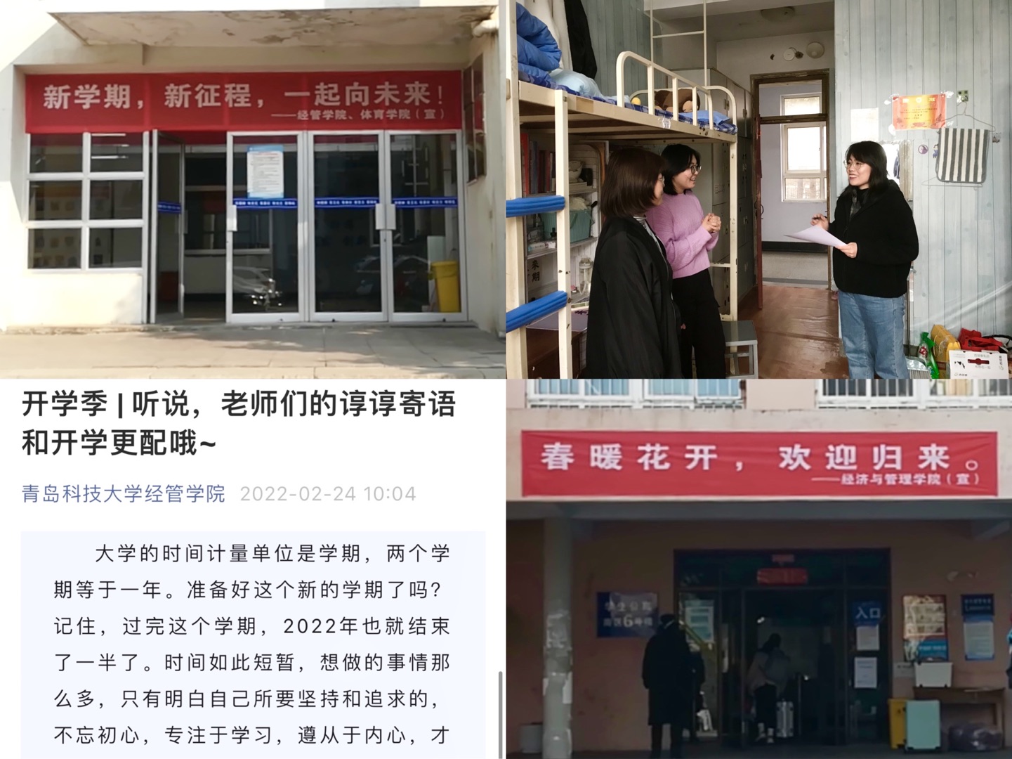依托“四个到位”,暖心护航让开学季有情怀有温度:“心理动态关注到位”,学工队伍第一时间开展“一对一”返校服务工作,针对夜间返校学生、因疫情暂缓返校学生、学业困难、家庭困难等不同类型学生开展深入交流,积极做好心理关注与疏导,确保学生安全稳定;“场景育人氛围到位”,充分发挥校园场景的文化育人效能,在德扑楼、宿舍楼门口、宿舍楼道等区域悬挂横幅并张贴开学标签,送上新学期的祝福,带给学生满满的归属感;“指导帮扶跟进到位”,组织教师为学生送上开学“锦囊妙计”与新学期暖心寄语,引导全体学子迎战新学期、积极向未来;“服务关怀暖心到位”,院领导、全体辅导员深入学生宿舍,了解返校学生的生活学习现状,持续做好学生返校后的人文关怀与呵护。正如2021级学生于辰洋所说,“返校旅途虽然辛苦,但是进入校园后看到热情迎接我们的老师、精心布置的校园场景与及时组织的核酸检测,让我们内心感到无比的踏实、温暖与感恩”。