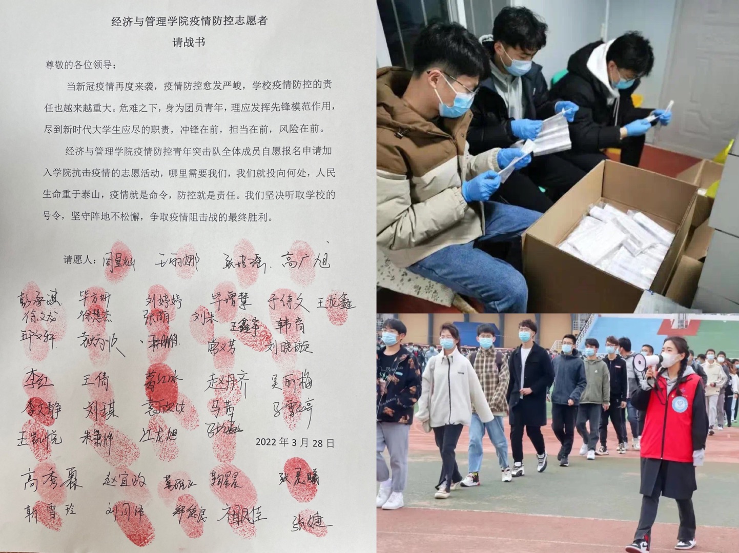 全体党员纷纷提交“请战宣言”:“我们要请战,因为我们是党员,关键时刻就该挺身而出”,“如果可以,请把我安排在后半夜,我是男生,绝对没问题!”这是党员们的声音,他们是这么说的,也是这么做的。这些党员里,有即将奔赴西部进行支教的毕业生,有刚刚助力团队完成挑战杯国赛答辩,“才下战场又上一线”的“国奖”获得者,有刚刚成为预备党员,全力希望实现个人价值的大三学生...他们真情提交“”,并郑重签上名字,按上手印。当前,学生党员已纷纷加入到学校疫情防控志愿服务工作中来,全力配合学校做好疫情防控工作。