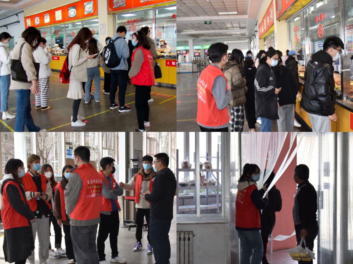 疫情防控青年突击队”穿梭在食堂的每个角落,他们在学校南苑食堂门口及窗口进行监督提醒,督促同学们佩戴口罩,协助食堂工作人员测量体温、引导取餐人员在排队取餐时保持一米间隔,为大家宣传防疫知识,维持秩序。周二的食堂里,取餐队伍秩序井然,与志愿者们组成的防线交相辉映,此刻的责任与温暖并行,温暖着每一颗心。来来往往的师生对这群“突击队员”的热情细致频频竖起大拇指,“为他们点赞!食堂秩序更好了,买饭反而更快了”,身为志愿者的21级财务管理专业刘雪祯同学说,“我们的提醒被记住了”,一丝暖意让一天的倦意全消。