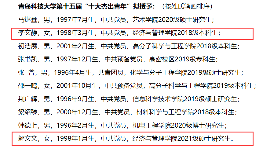 在中国共青团成立100周年之际,为在全校青年学生中选树优秀青年典型,发挥优秀学生在广大青年同学中的模范作用,近期,学校启动第十五届“十大杰出青年”评选活动。根据《青岛科技大学“十大杰出青年”评选办法》(青科大党字〔2008〕12号)的精神要求,经各单位推荐,评选活动组委会相关部门和团委委员评选,我院2021级研究生解文文、2018级本科生李文静荣获青岛科技大学第十五届“十大杰出青年”称号。