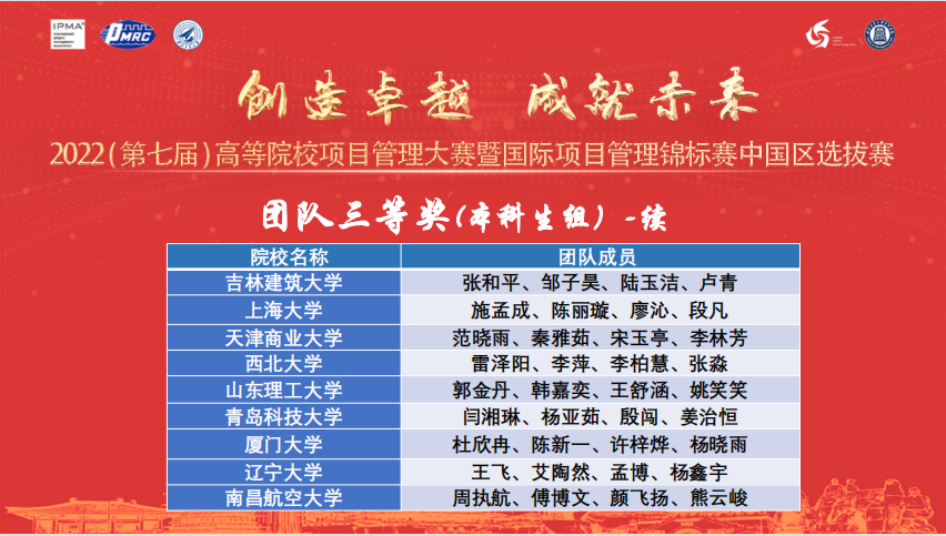 据悉,大赛已经成功举办六届,国际项目管理锦标赛(Project Management Championship)是全球成立最早且最具影响力的国际项目管理专业组织——国际项目管理协会(IPMA)主办的面向全球高校学生的全球性项目管理创新性竞赛。全国高等院校项目管理大赛作为国际项目管理锦标赛的中国区选拔赛,本届大赛遴选出青岛科技大学、西北工业大学、桂林电子科技大学、中国石油大学(华东)、石家庄铁道大学、北京邮电大学、北方工业大学、清华大学、昆明理工大学、北方工业大学十支团队(分别有本科生组和研究生组),进入英文资格预选赛,具备条件的,将作为中国代表队参加国际项目管理锦标赛。