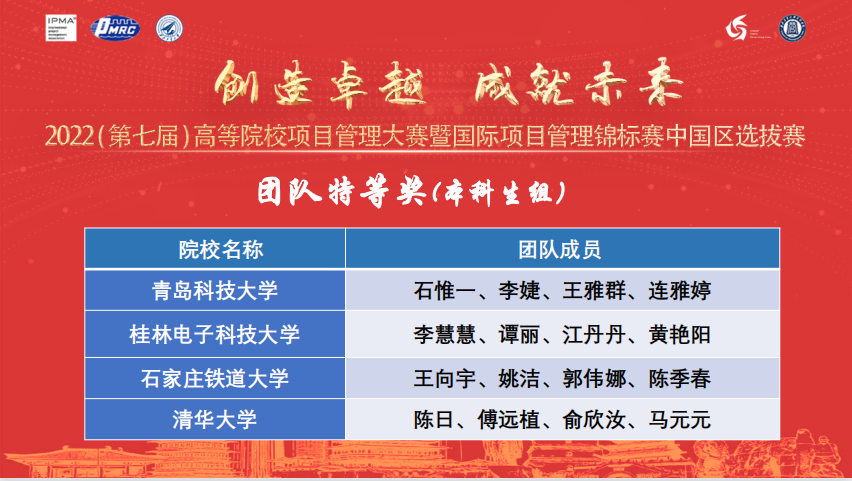 其中,由董华、黄天赐老师指导,石惟一、李婕、王雅群、闫湘琳、连雅婷同学的项目团队获特等奖,团队竞赛总成绩全国第一,并在候选代表中国参加国际项目管理锦标赛的队伍中成绩名列榜首;闫湘琳、杨亚茹、股闯、姜治恒同学的项目团队获三等奖。同时,李婕、石惟一、王雅群三名同学的个人成绩位列全国前三,取得了我校参加历届项目管理大赛的最优成绩。