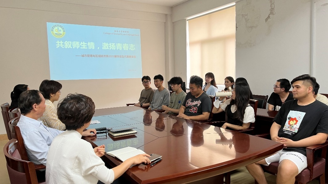 城市管理与区域经济系于德扑楼501会议室开展“共叙师生情,激扬青春志”2022届本科毕业生座谈会。党委班子成员联系支部领导宫攀,城管系教师代表及2022届毕业生代表参与座谈会。座谈会由系主任万婕主持。