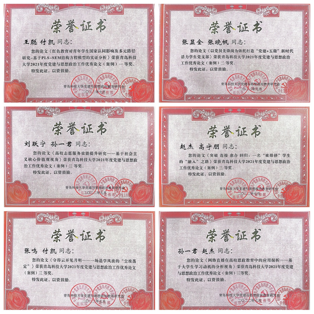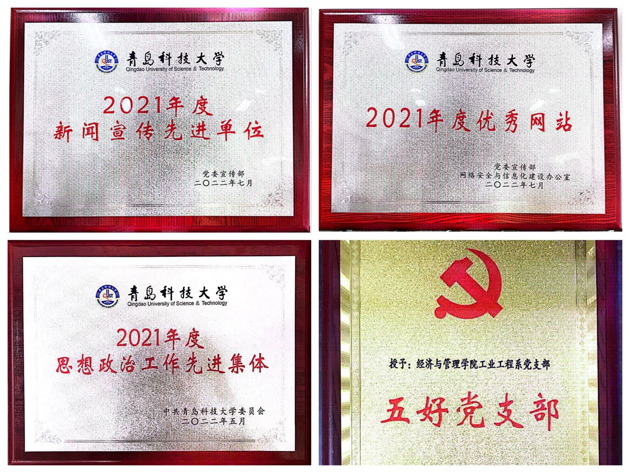 获2021年度新闻宣传先进单位、2021年度优秀网站,工业工程系党支部获思想政治工作先进集体、“五好”党支部,王聪获思想政治工作先进个人,索琪、王安琪(学生)获优秀共产党员。王聪、付凯撰写的论文《红色教育对青年学生国家认同影响及多元路径研究-基于PLS-SEM结构方程模型的实证分析》获优秀论文(案例)一等奖,张显全、张晓帆撰写的案例《以党员先锋岗为依托打造“党建+五微”新时代活力学生党支部》获二等奖,刘跃宁、孙一君撰写的论文《高校志愿服务效能提升研究——基于社会主义核心价值观视角》、赵杰、高守朋撰写的案例《突破 连接 愈合 回归:一名“被排挤”学生的“融入”之路》、张鸣、付凯撰写的案例《守得云开见月明——一场退学风波的“尘埃落定”》、孙一君、赵杰撰写的论文《网络直播在高校思政教育中的应用探析——基于大学生学习动机的分析视角》获三等奖。德州扑克俱乐部