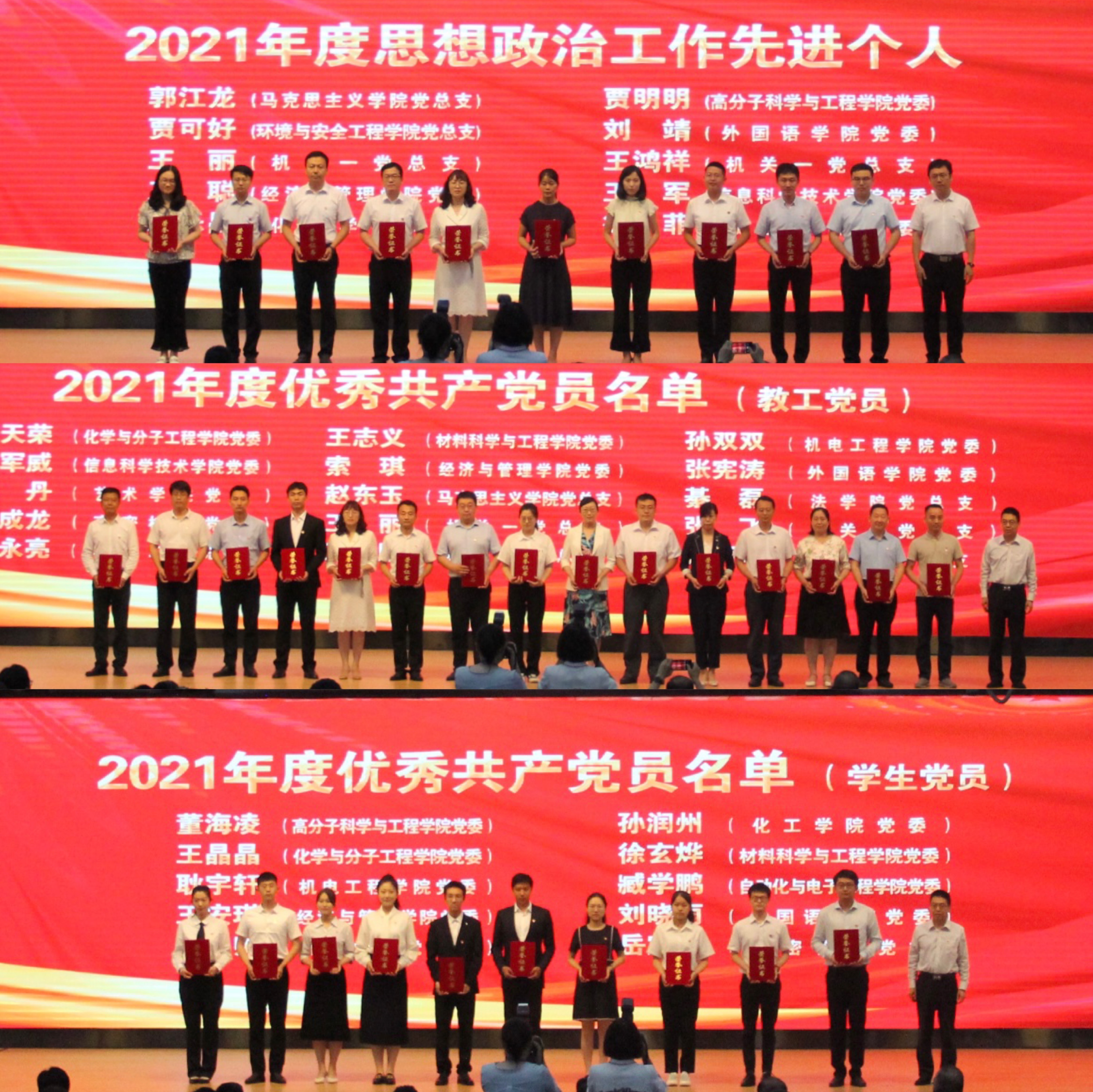 为庆祝中国共产党成立101周年,进一步表彰先进、提振精神、树立典型,7月1日下午,青岛科技大学2022年度党建与思想政治工作会议暨“光荣在党50年”纪念章颁发仪式于崂山校区第二报告厅隆重召开,我院党员师生代表参加会议。