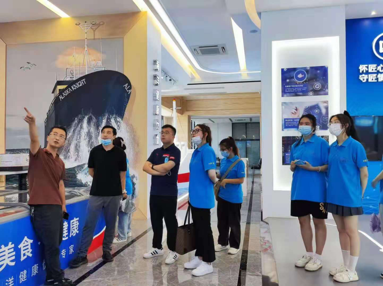 实践团的第二站是胜田食品有限公司,公司成立于1995年,人力资源部经理向实践团成员介绍了“匠心为胜,耕海如田”的企业精神,以及公司融入元洪新区的建设历程。现如今,公司先后获得福建省水产产业化龙头企业、福州市农业产业化龙头企业等荣誉,同时积极开辟国内外市场,追求品牌效益,做大做强鳗鱼、海参、北极蚌等畅销国内外的明星产品。在企业的设施建设方面,胜田不断推动国际化和机械化进程,自动生产线12条,自动化速冻机(IQF)两条,速冻间5座,日加工鱼糜制品及肉制品能力达120吨,年产量达2.16万吨,是“福州鱼丸之都”核心企业之一。