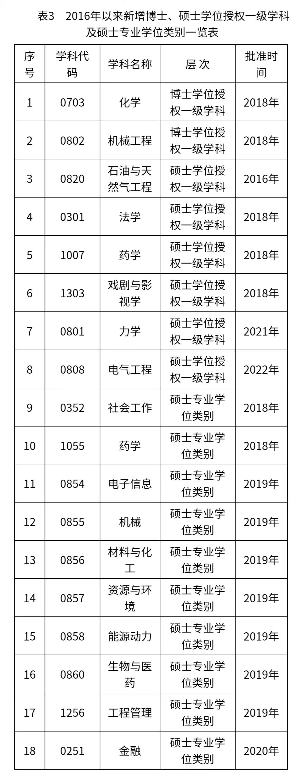 自2016年以来,学校获批化学、机械工程2个博士学位授权一级学科,法学、药学、戏剧与影视学、力学、电气工程5个硕士学位授权一级学科,社会工作、药学2个硕士专业学位类别。在工程硕士专业学位授权点对应调整工作中,将12个工程领域调整成电子信息、机械、材料与化工、资源与环境、能源动力、生物与医药、工程管理7个专业学位类别。学校坚持“有所不为”原则,主动撤销发展前景不好的精密仪器及机械、情报学2个硕士学位授权点,对应调整增列石油与天然气工程、金融2个硕士学位授权点(表3)。截至目前,学校共有5个博士学位授权一级学科,24个硕士学位授权一级学科,16个硕士专业学位类别,实现了各教学德州扑克俱乐部