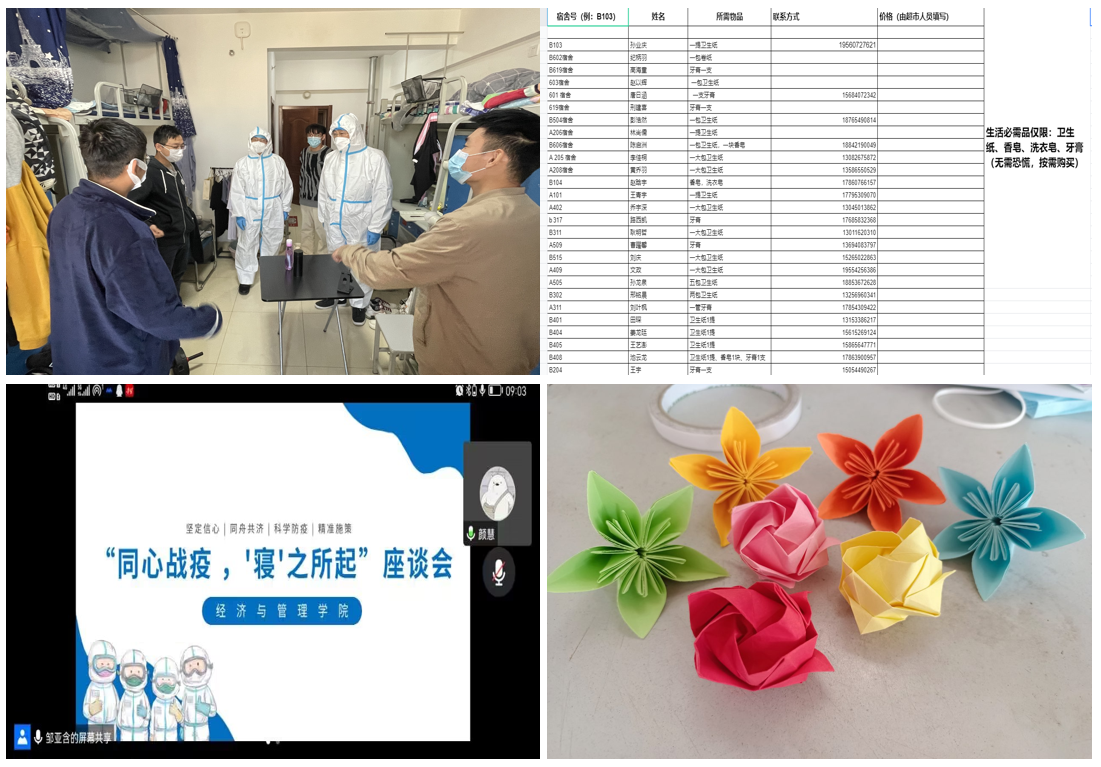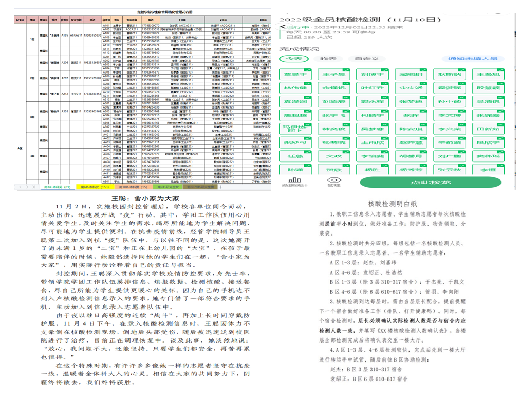 书记、院长及辅导员深入学生宿舍,了解学生的生活情况,完成学生一对一谈话及重点学生访谈工作,确保特殊时期安全稳定;各宿舍楼宇通过建立在线表格,及时调研、收集静默同学的各项需求,整理成任务清单,最快速度解决问题;静默管理解除后,德州扑克俱乐部