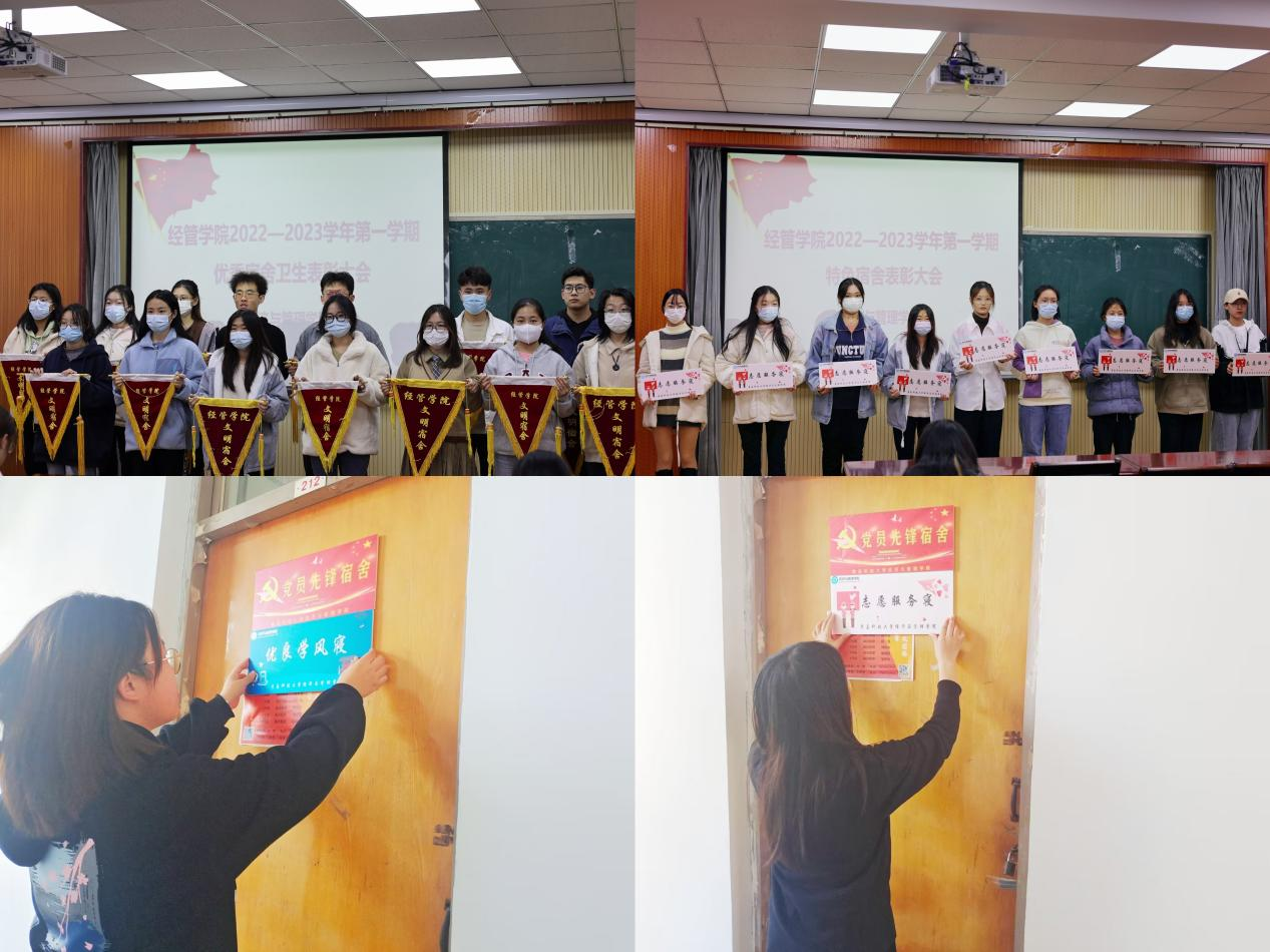 宿舍是学校实现管理育人、环境育人和服务育人的重要阵地,是学校精神文明的窗口,我院通过“自荐+评审”的方式筛选出优秀宿舍,并颁发“党员先锋宿舍”“志愿服务寝”“活力体育寝”“优良学风寝”多元化定制门牌,充分发挥党员和青年榜样的带头作用,利用宿舍第二课堂,树立优良学风,促进同学间相互学习,锐意进取,向优秀宿舍看齐。