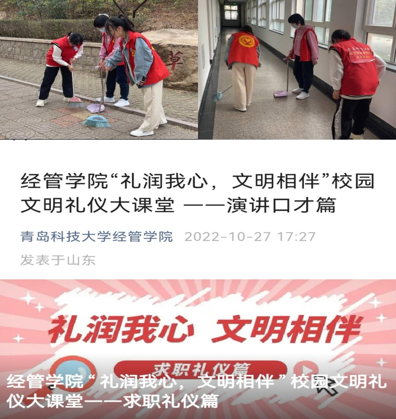 公众号推送“校园文明礼仪大课堂”系列文章,从求职礼仪、演讲口才等方面引导同学们保持良好的礼仪习惯,践礼仪之行,争做时代先锋青年。