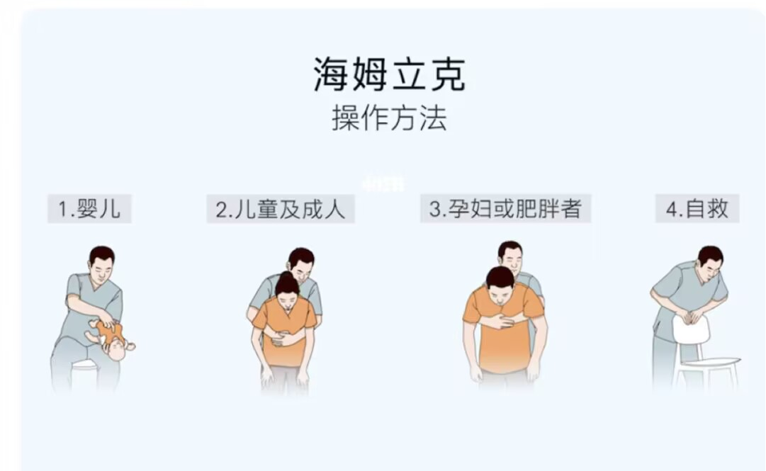 4.海姆立克急救法(异物卡喉):对于3岁以上患者,被救者可处于坐位或立位,施救者站于被救者后背,双手环抱被救者,以右手拇指掌指关节,即较硬骨性结构,置于腹部正中其上位置。另一手按压在右手拳头上,向上向内快速冲击6-10次,此时胸腔内压迅速上升,有利于气道中的异物排出;因此对于3岁以下儿童,第一种方法可能会造成患儿的二次损伤,如果发生气道阻塞导致窒息,可将患儿倒扣在施救者膝盖上,使患儿头部尽可能低于膝盖平面,右手迅速拍击患儿后背1-5次,此时有可能使患儿气道内的异物经口排出。