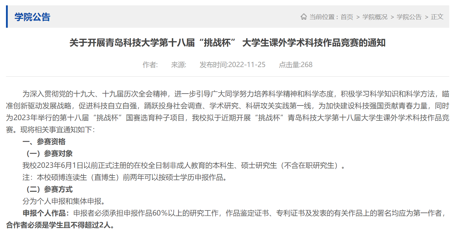 大赛营造大学生积极从事科技创新活动的浓厚氛围,培养学生的创新精神、探索意识和实践能力,面向我校具有正式学籍的全日制普通本专科、研究生在校学生,形式分为个人申报和集体申报,申报参赛的作品必须是距2023年6月1日前两年内完成的学生课外学术科技或社会实践活动成果,鼓励申报跨学科作品和多学科交叉的作品。