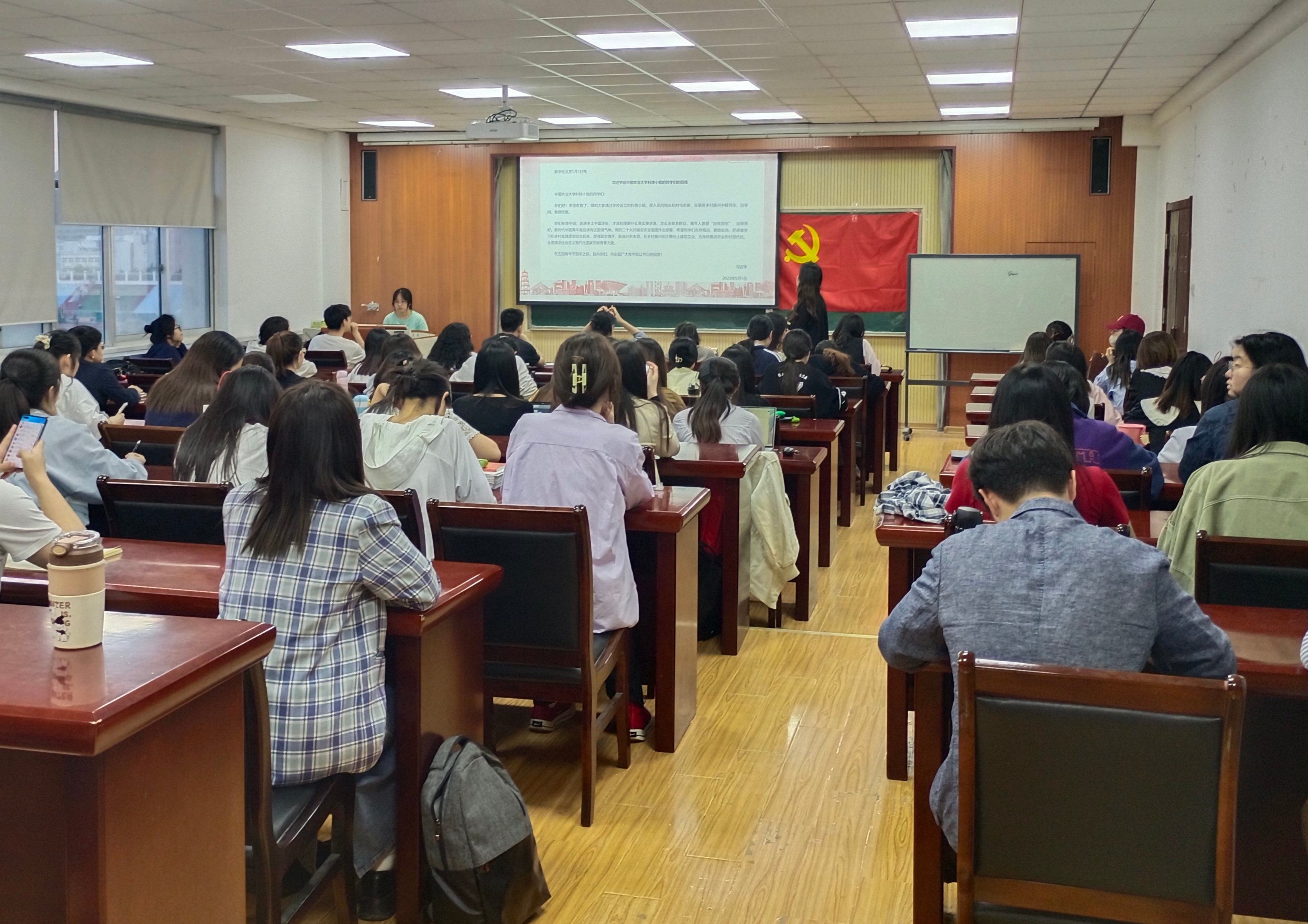 深学原文观事迹。全体党员集体学习习近平总书记在学习贯彻习近平新时代中国特色社会主义思想主题教育工作会议上的重要讲话精神,深刻领悟主题教育是贯彻落实党的二十大精神的重大措施、对推动实现各项工作实现新发展有重大意义。在学习会上,全体党员集体学习《习近平给中国农业大学科技小院的同学们的回信》原文,并通过观看中国农业大学科技小院事迹视频,深刻感受总书记对在乡村振兴大舞台上建功立业的广大青年的鼓舞与激励,并明确了作为大学生党员,要怀抱梦想、脚踏实地,为全面建成社会主义现代化强国贡献青春力量。