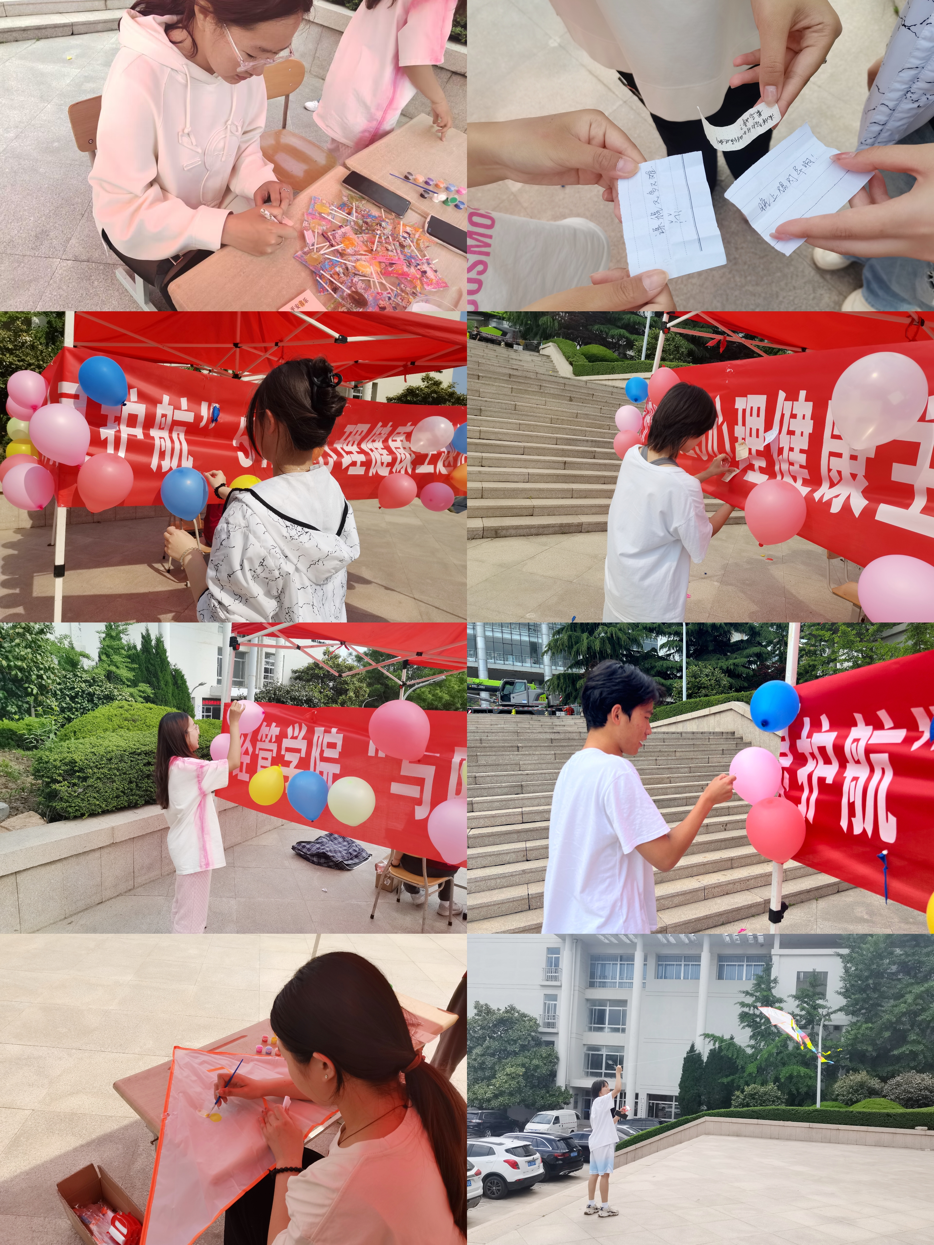 “Go吧,烦恼君”暖心放飞行动中,同学们在纸条上写下最近的烦恼问题,互相扎破气球,解答彼此的烦恼,最后,将纸条粘贴在风筝上,在放飞风筝的过程中,让烦恼一同随风飘远。此次活动中,同学们相互治愈,在彼此之间传递善意与温暖,拉近了同学们内心的距离。