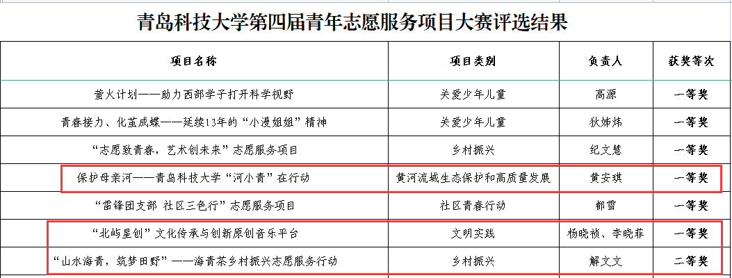 共组织12支优秀项目参与比赛,其中,“保护母亲河——青岛科技大学‘河小青’在行动、“北屿星创”文化传承与创新原创音乐平台项目荣获一等奖,“山水海青,筑梦田野”——海青茶乡村振兴志愿服务行动项目荣获二等奖,同时,以上3个志愿服务项目均成功推荐至省赛。