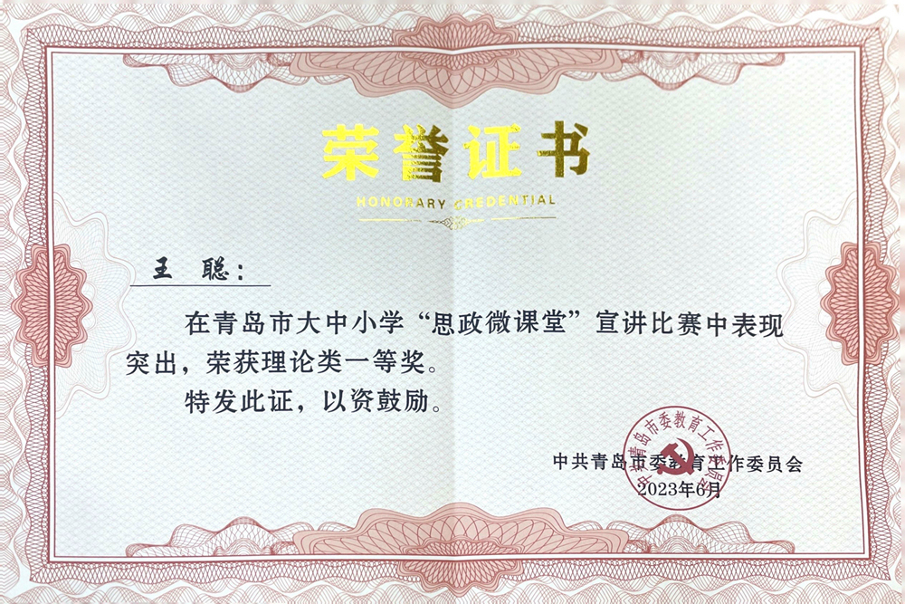 王聪老师担任宣讲人,是主题教育期间思政理论宣讲取得的又一项重要成果。本次宣讲比赛紧紧围绕“中国梦·新时代·新使命”主题,通过青岛市大中小学初赛评选和现场比赛角逐,宣讲作品获理论类一等奖(理论类表彰一等奖3名,二等奖3名,三等奖6名),并被推荐参加青岛市百姓宣讲比赛,最终斩获大赛理论类一等奖(理论类表彰一等奖4名,二等奖5名,三等奖8名)。
