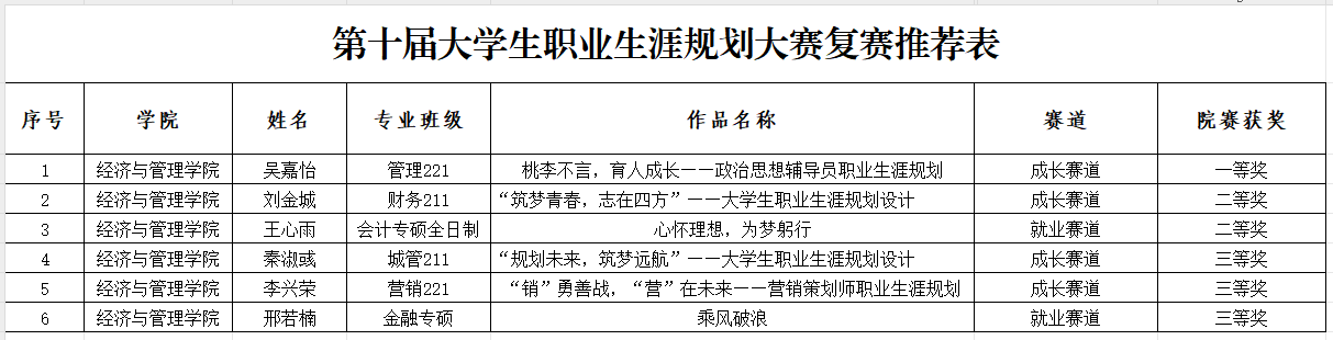 经过参赛学生激烈角逐,评审委员会研究认定,在成长赛道的评比中,管理221吴嘉怡获一等奖,财务211刘金城、会计专硕全日制王心雨获二等奖,城管211秦淑彧、营销221李兴荣、金融专硕邢若楠获三等奖。获奖作品将直接推荐至校赛。