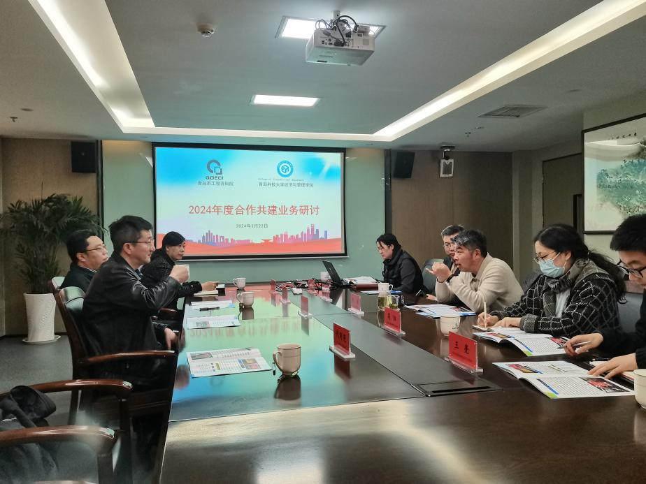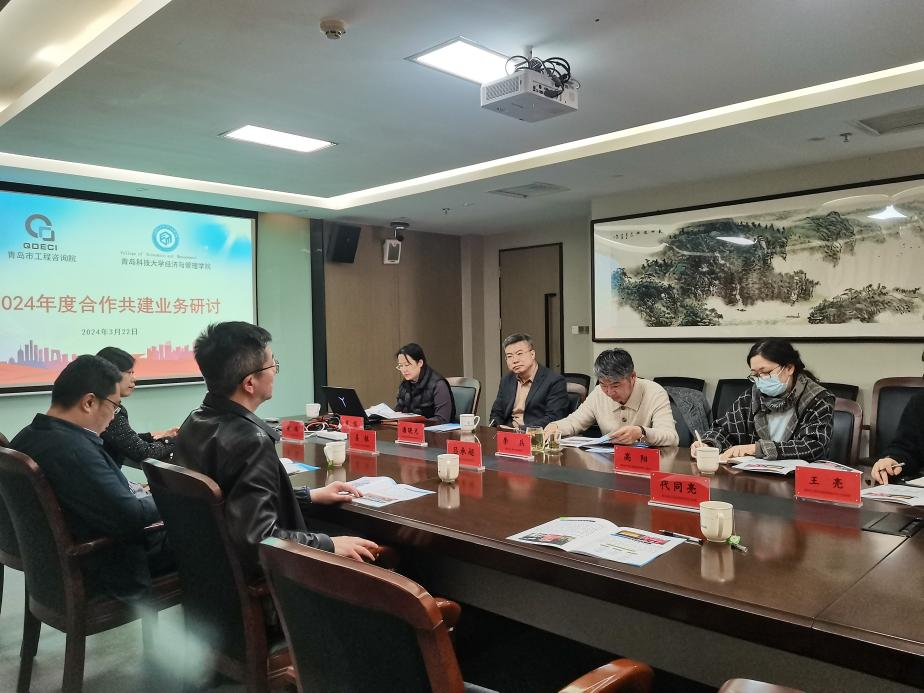 与青岛市工程咨询院就合作共建业务展开座谈研讨会。青岛市工程咨询院李兵副院长、政策规划主任高阳主任、潘晓光主任、章程、王亮等参与,青岛科技大学德州扑克俱乐部