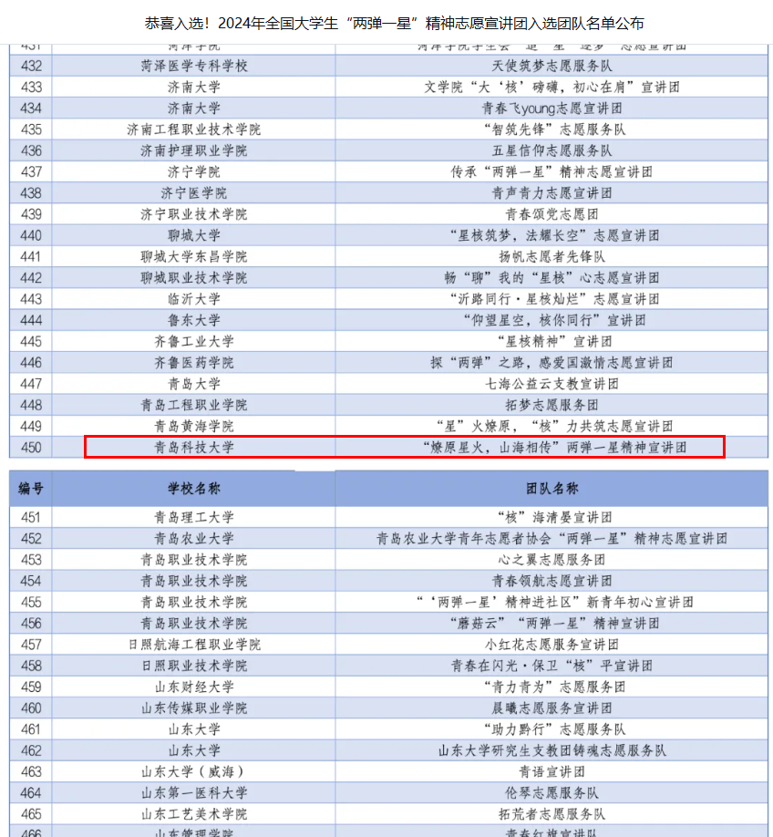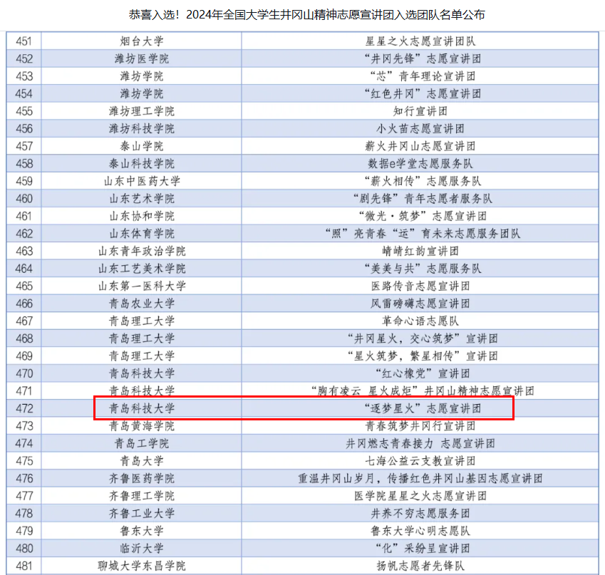 共有3支团队成功入选。其中,“逐梦星火”志愿宣讲团入选2024年全国大学生井冈山精神志愿宣讲团(队长:张妙可),“初心闪耀”志愿宣讲团入选2024年全国大学生延安精神志愿宣讲团(队长:林昊),“燎原星火 山海相传”两弹一星精神宣讲团入选2024年全国大学生“两弹一星”精神志愿宣讲团(队长:马庆宇)。