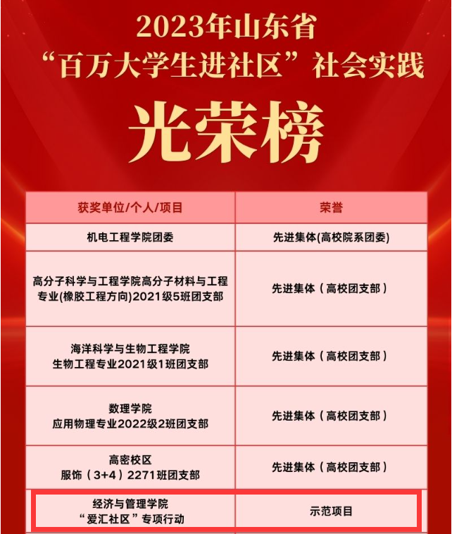 近日,共青团山东省委公布了2023年度“百万大学生进社区”社会实践项目表扬通报名单,我院“爱汇社区”专项行动获“示范项目”表彰。
