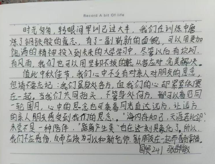 举行“传文明 话中秋 汇文艺 颂党情”新生中秋团建活动,在操场设立中秋邮电箱,同学们以打电话、发短信或书信的方式,给远在他乡的亲朋好友传递思念、分享生活、送上祝福。组织学生拍摄与中秋有关照片,使用涂鸦笔、贴纸等功能进行绘制,形成自己的中秋打卡。此外,同学们在教室举行中秋爱国主义观影活动并书写感悟。