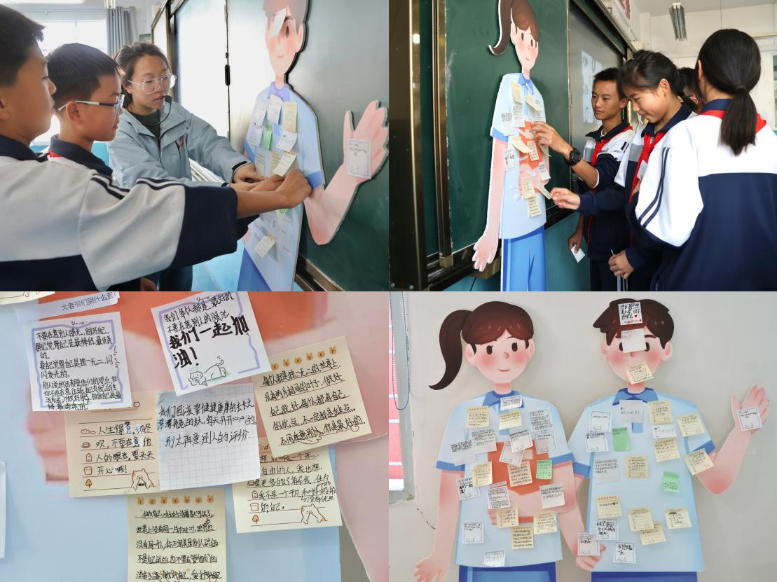 随后,研支团志愿者组织孩子们通过为他/她撕掉标签的方式,让学生客观、积极的审视“负面评价”与“消极标签”。孩子们开始还有些害羞,在研支团成员的鼓励下,他们勇敢的撕下了各种各样的标签,收获直面自我的勇气,并将承载着美好希望的爱心便利贴贴了上去,简单的一撕一贴,对应了孩子们心态的转变,撕下负面的标签,拒绝横加的定义,以勇敢和自信的状态面对多元的自己,同学们脸上都洋溢着开心的笑容。
