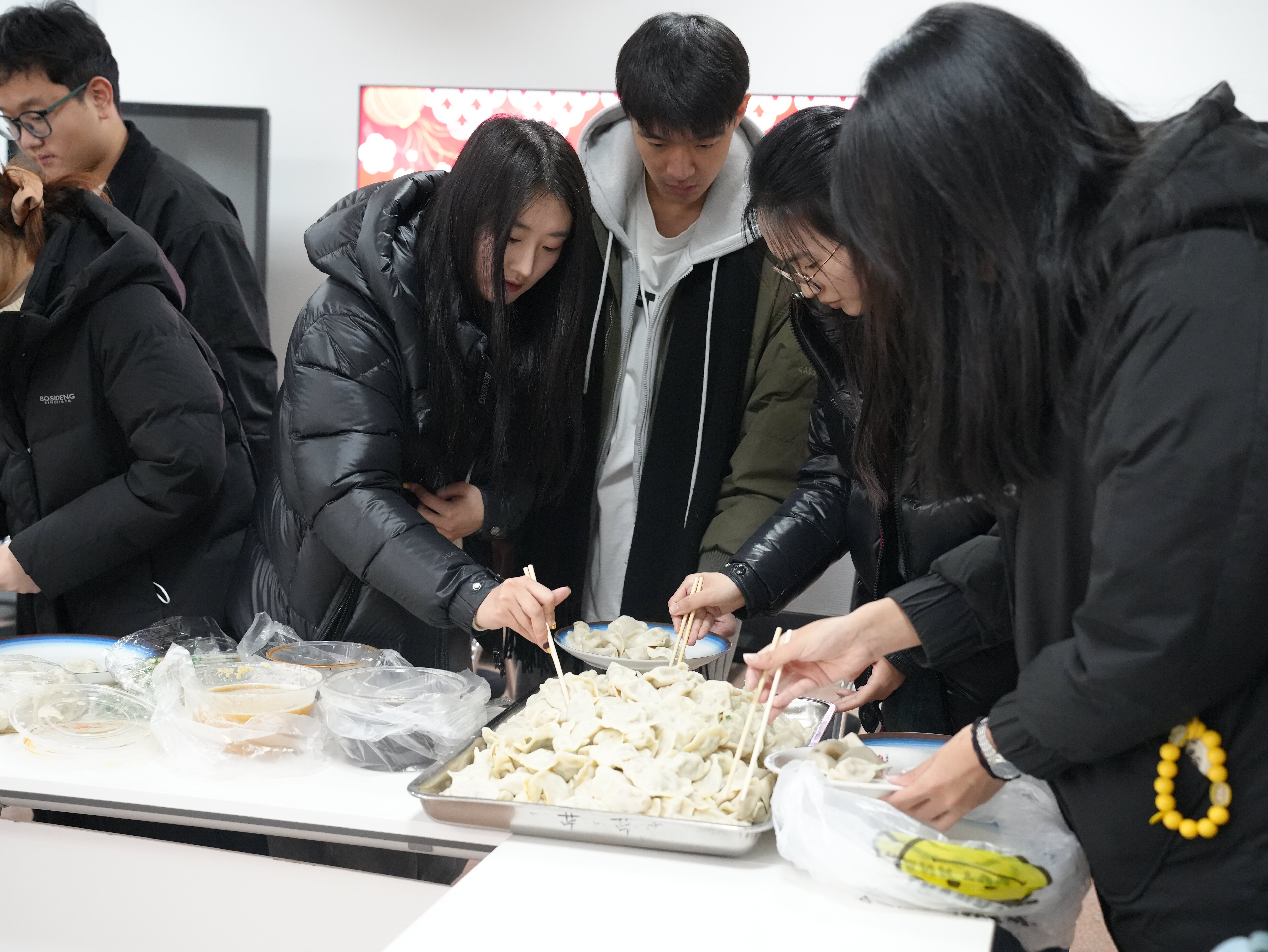 在朋辈力量和领跑学长的带领下,同学们围桌而坐,一起分享饺子,畅谈近期的学习生活与未来规划。学长学姐们暖心的问候让同学们倍感亲切,冬至虽寒,同学情暖。