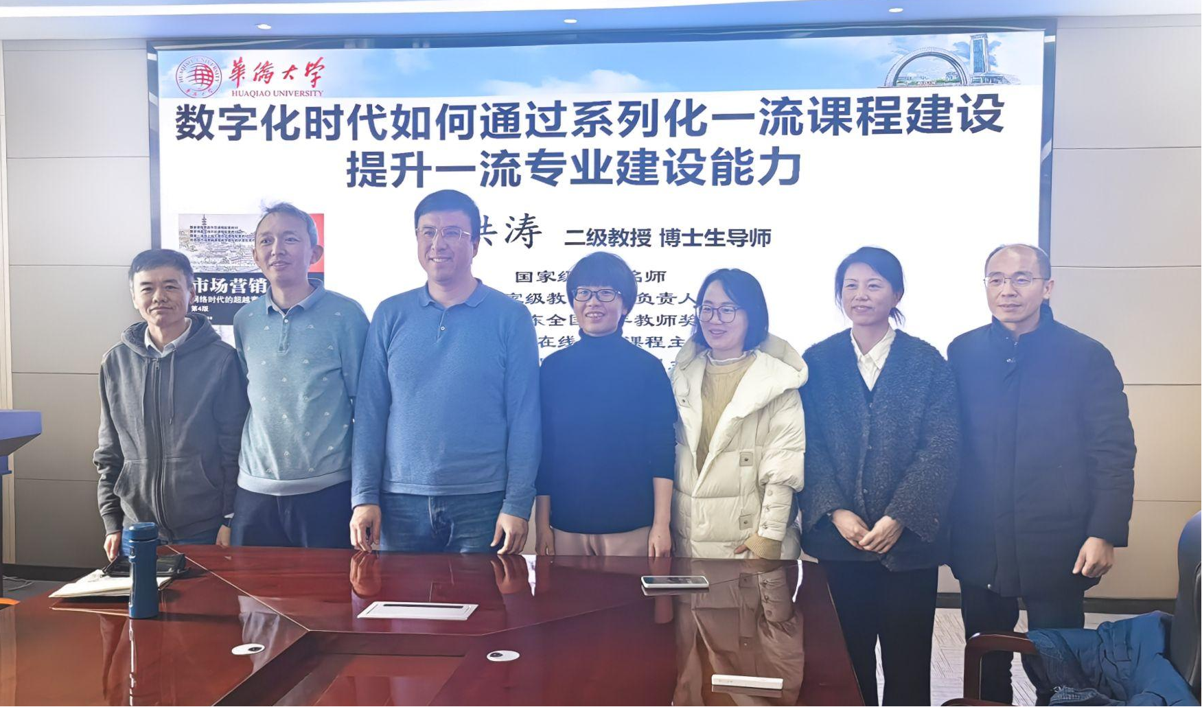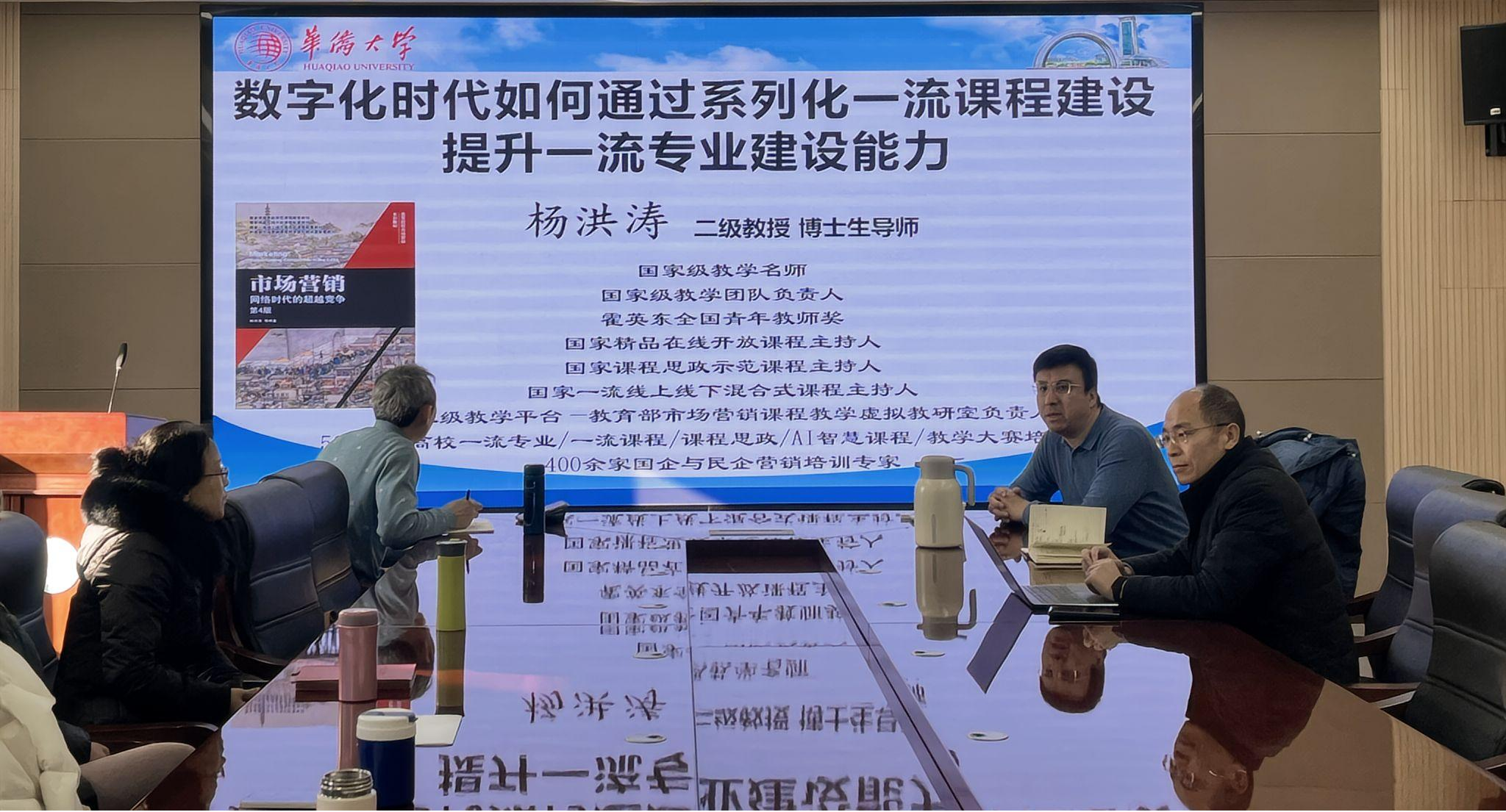 为了推动我院国家一流专业与课程建设水平的进一步提升,我院作为教育部市场营销课程教学虚拟教研室成员单位荣幸地邀请到了国家级教学名师、国家级教学团队负责人以及国家一流专业负责人——华侨大学教授杨洪涛。杨教授就国家课程建设和教学改革相关政策、智慧课程实践等议题进行了深入的分享与探讨。