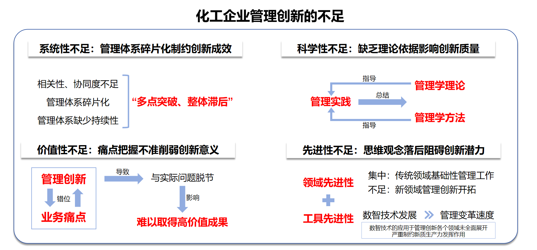 管理创新与业务痛点错位影响管理创新取得高价值成果的关键。其主要原因一是企业组织诊断能力薄弱,缺乏对需求痛点的系统分析识别。职能栅栏的存在使得职能部门各自为政,局部作战,部门本位主义出发很难从全局高度判断分析管理问题,此外,企业缺乏专业的方法工具进行管理问题的识别评估,导致应对策略与需求错位;二是短期主义思维主导难以产生有价值成果。管理层往往希望管理创新能够快速见效,忽视管理创新产生效果的时滞性,现实中好的创新往往需要较长时间的磨合和反复迭代,短期主义倾向使得企业浅尝辄止,或者中途放弃难以坚持下去。三是创新参与者的能力局限,缺乏对管理问题的精准把握。管理创新往往需要多专业领域的协同合作,创新团队知识结构存在缺陷,不仅缺乏高素养的管理专业人才,更缺乏既懂技术又懂管理的复合型人才,限制了管理创新的水平。
