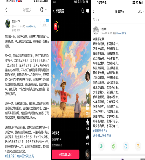 积极组织全体学生参与“全国大学生国家安全知识答题”专项活动,聚焦政治安全、网络安全、经济安全等16个重点领域,通过“学-练-测-评”闭环体系,引导学生将国家安全意识转化为日常行动自觉;广泛动员学生围绕“全民国家安全教育”创作短视频、海报、征文等创意作品,通过“线上+线下”双线融合,让青年真正懂安全、讲安全。