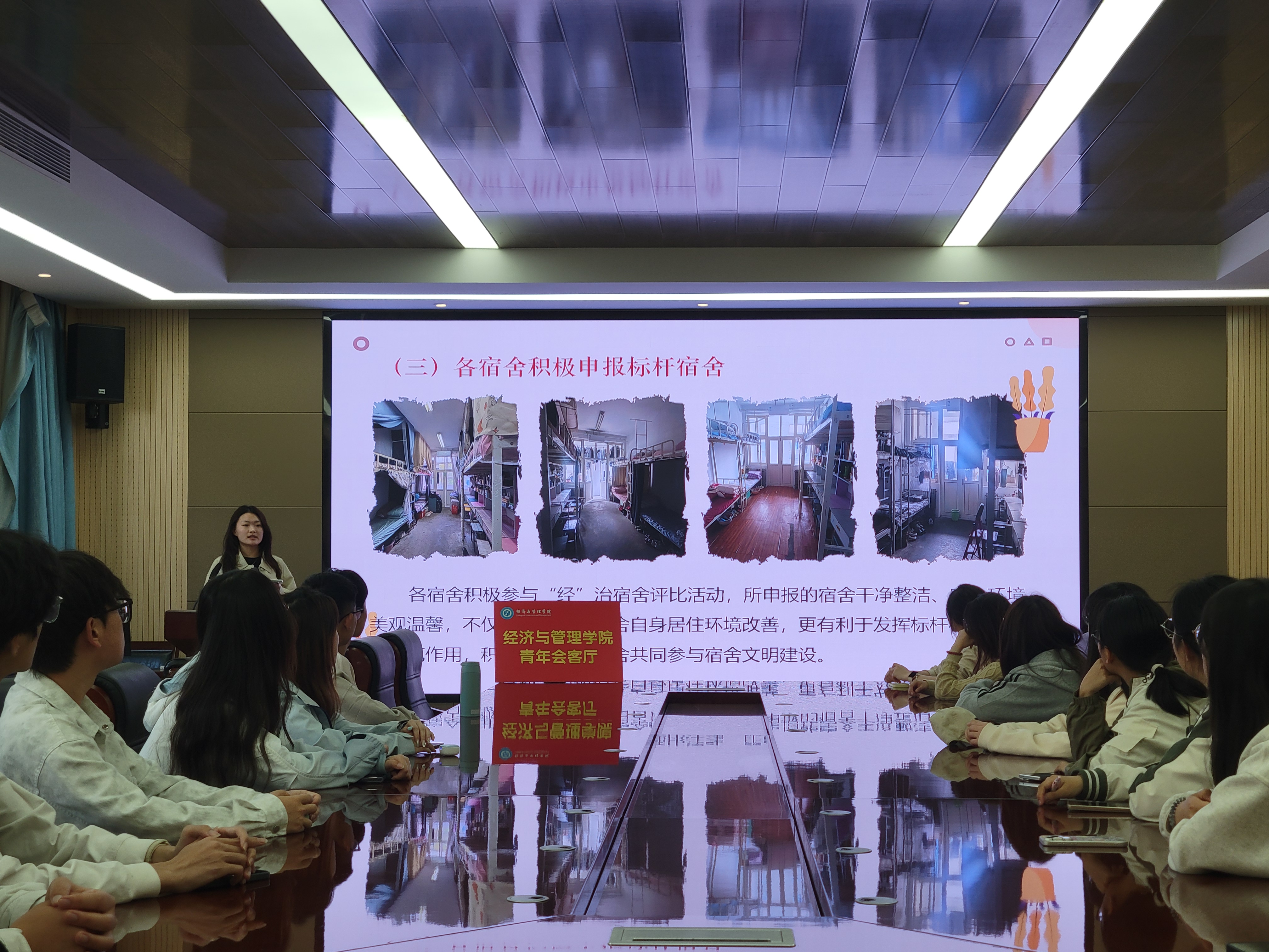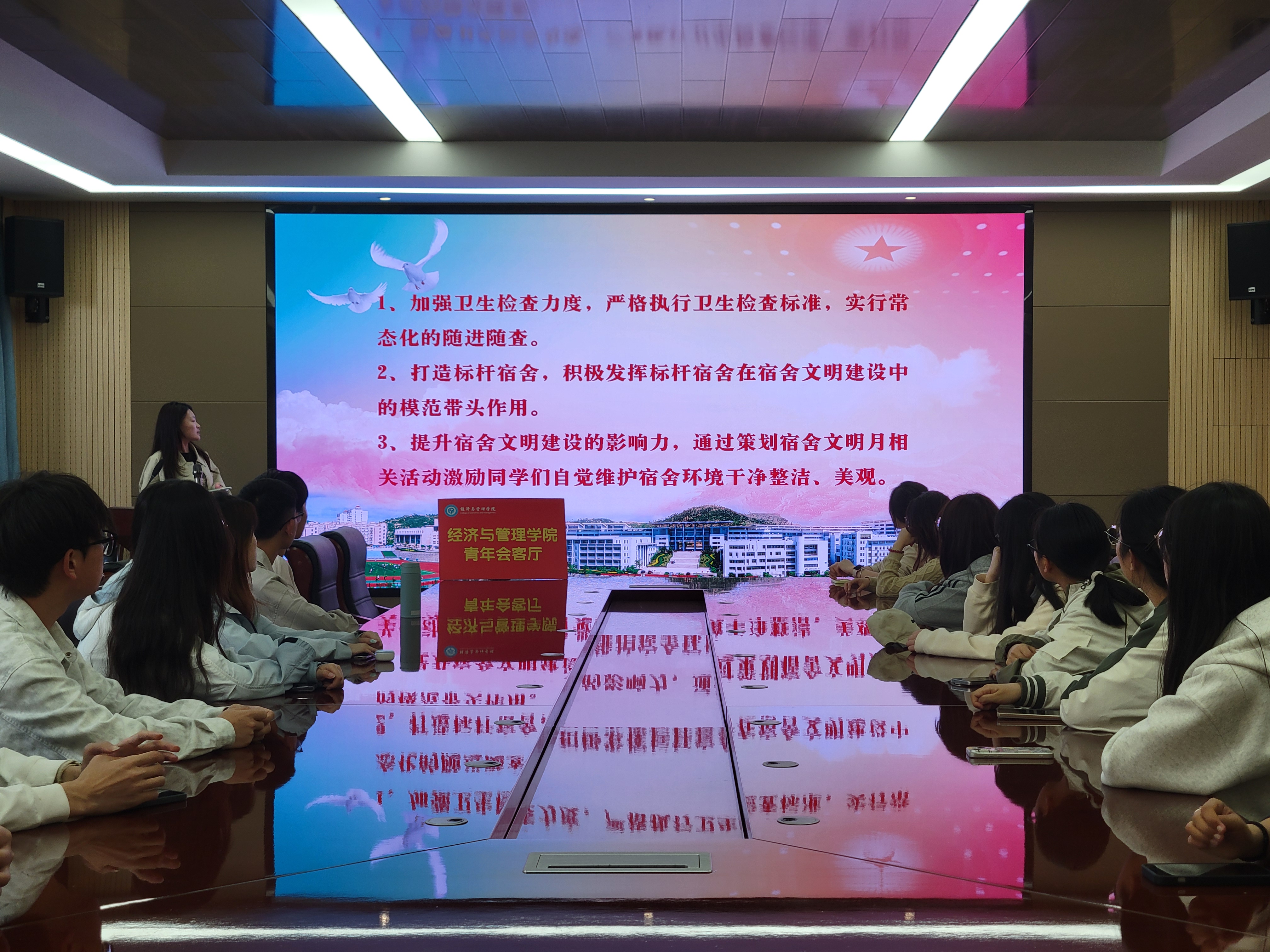 依托青年会客厅,于2025年4月22日下午在德扑楼313举办文明宿舍建设推进会暨“经”治宿舍责任书签约仪式。本次活动邀请了各申报宿舍舍长与学生会部分负责人参加,共同为打造文明宿舍出谋划策、携手共进。