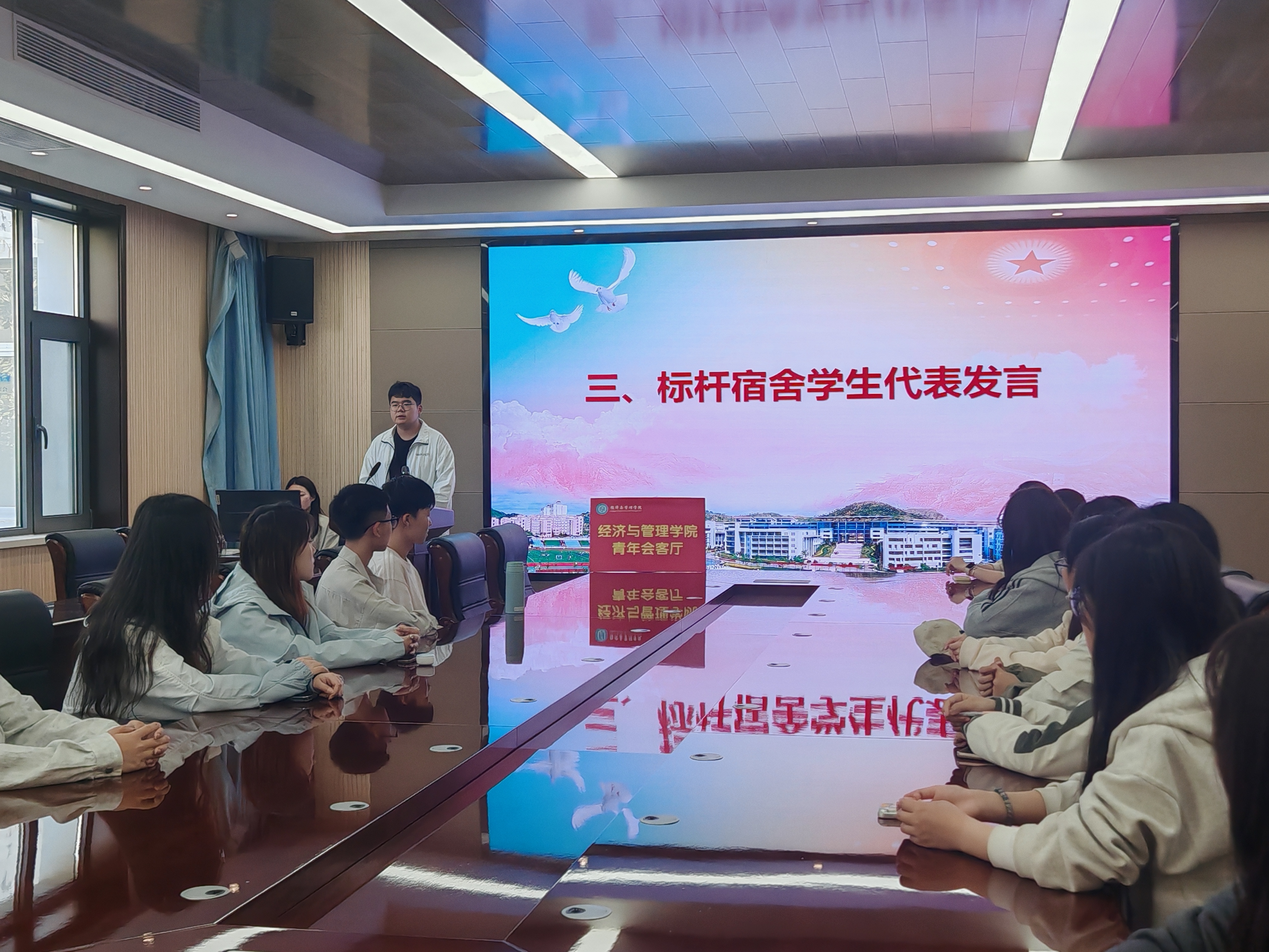 接下来,申报“经”治宿舍建设标杆的学生代表围绕文明宿舍建设经验进行发言。该宿舍始终秉持着团结协作、共同进步的理念,制定了详细的值日表,确保宿舍卫生整洁;合理安排作息时间,营造安静的学习环境;积极参与宿舍文化活动,让宿舍充满温馨。这些经验为其他宿舍提供了可借鉴的模式,赢得了现场阵阵掌声。