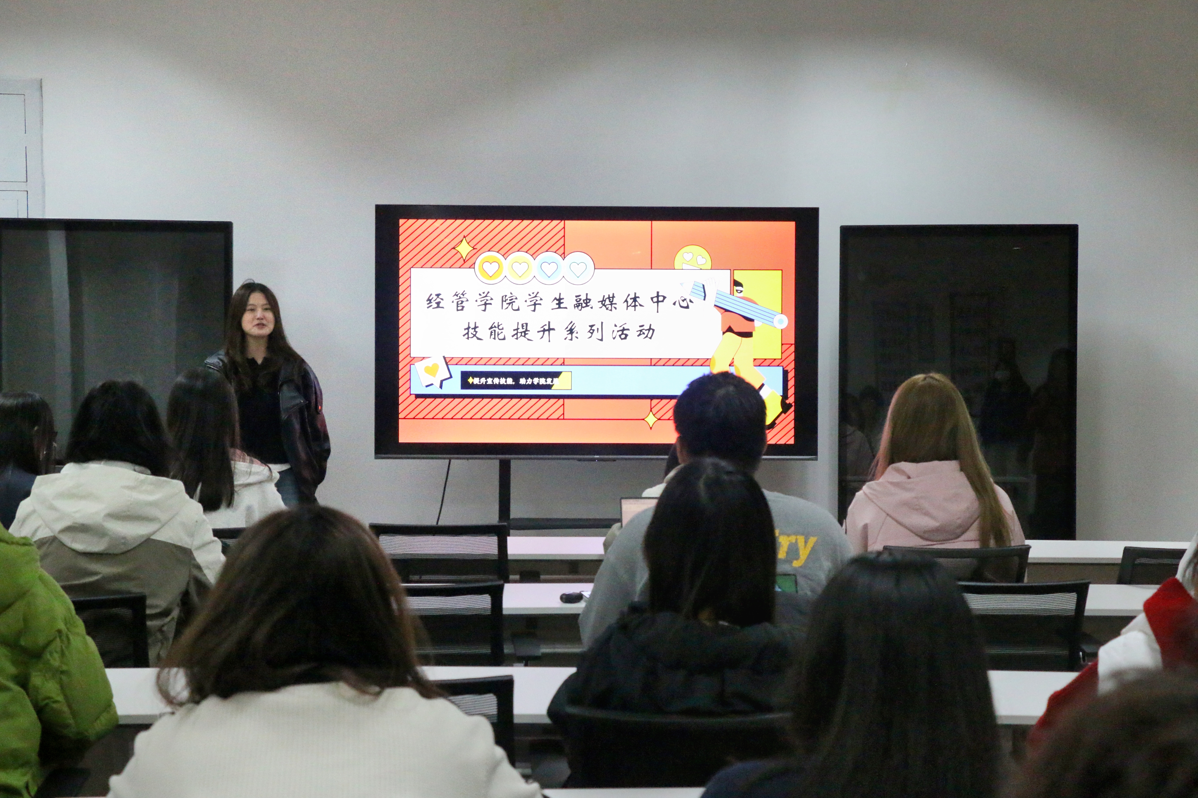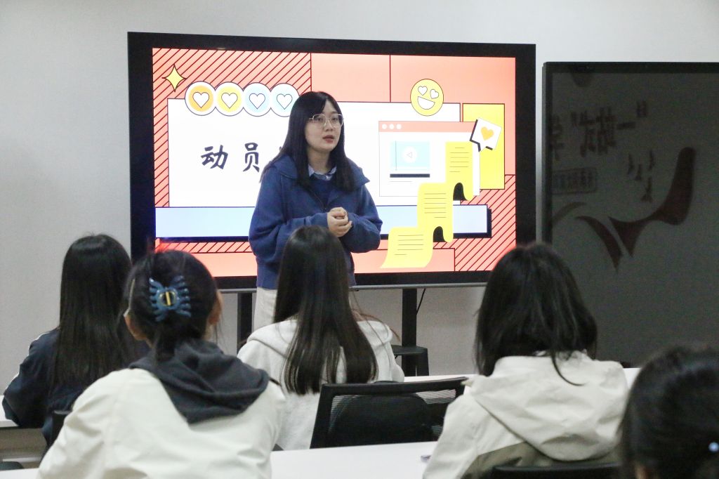 学生融媒体中心成员开展培训。她结合校园活动宣传、德州扑克俱乐部
