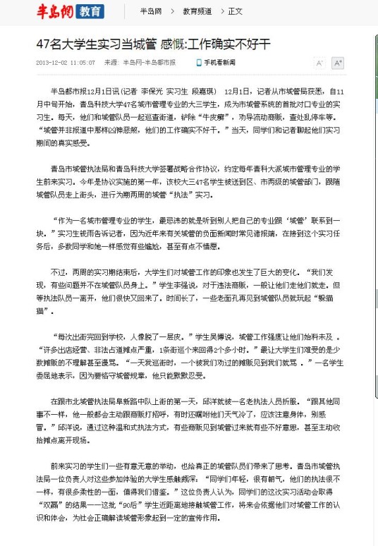 青岛新闻网、半岛网等多家网站报道城市管理专业学生实习