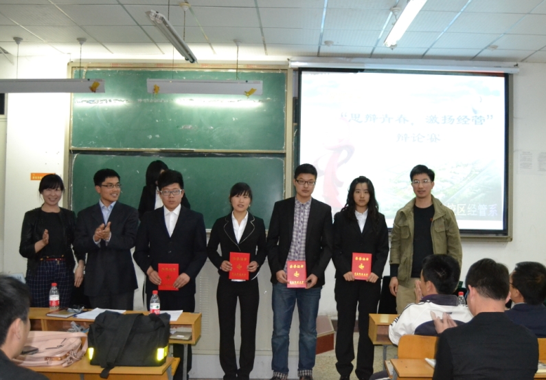 首战由国贸茶叶蛋组合对战市营群英队,就“用折抵学分的方式鼓励大学生参与志愿者活动的利与弊” 话题展开激烈辩论,双方辩手你来我往,唇枪舌战,最终群英队获胜,赢得晋级机会,与财务事务所的吐槽小分队进行决赛,决战双方围绕“大学生是否应该恋爱”问题再次交锋,最终,群英队险胜,夺得本次比赛的冠军。李春佳和杨友才老师,分别对两组辩论进行了精彩的点评,并对辩手们提出了肯定和激励。与会老师为一、二、三等奖及最佳辩手颁发证书并合影留念。