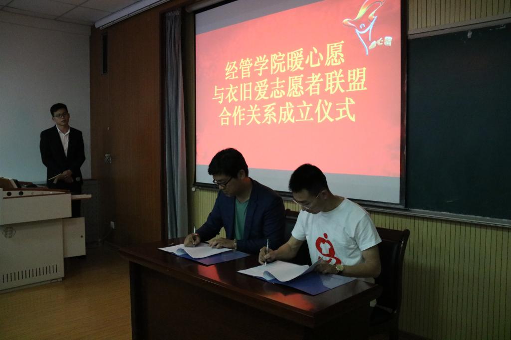 暖心愿近年来在关爱自闭症儿童、为贫困地区儿童募捐衣物所做出的努力,并对衣旧爱联盟的到来表示热烈欢迎,希望双方的合作能为更多需要帮助的人送去温暖。衣旧爱志愿者联盟会长王龙对志愿者联盟“奉献、平等、仁爱、共享”的宗旨进行了深入阐释,并结合发展历程为在场同学上了一场触人心灵的公益课。随后,双方共同签约,德州扑克俱乐部