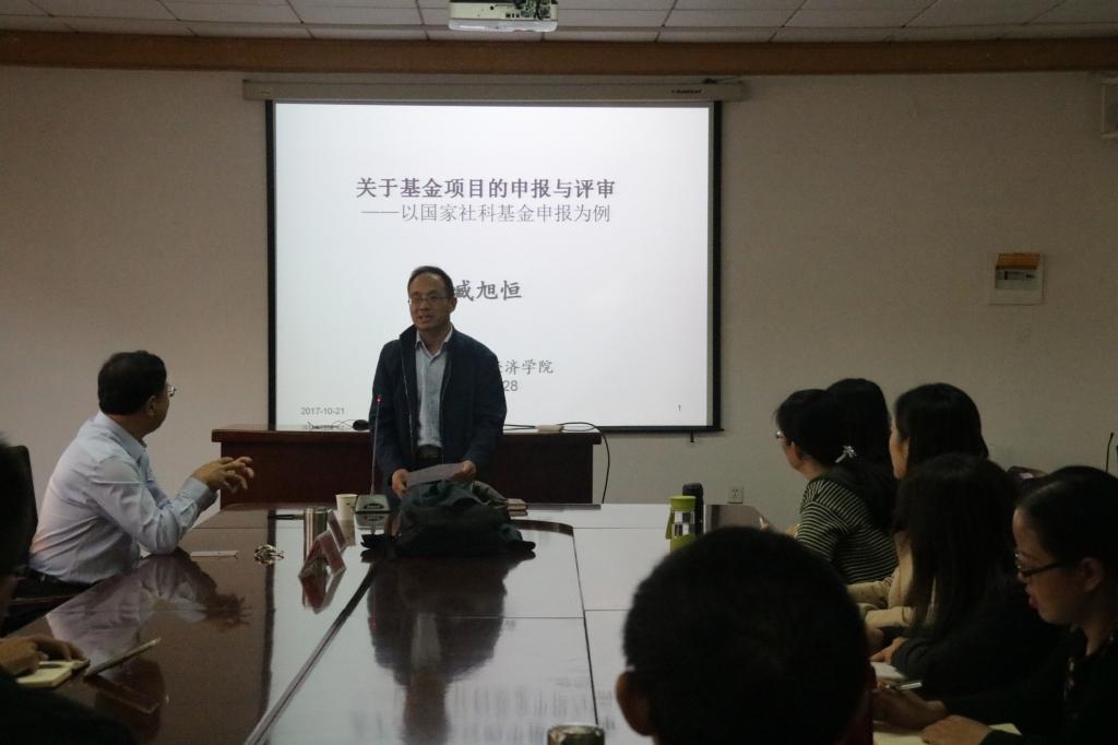 313会议室,青岛科技大学特聘教授臧旭恒老师为我院全体老师带来了题为《国家社科基金的撰写以及注意事项》的精彩报告,报告会由人文社科处处长李勋来主持,德州扑克俱乐部