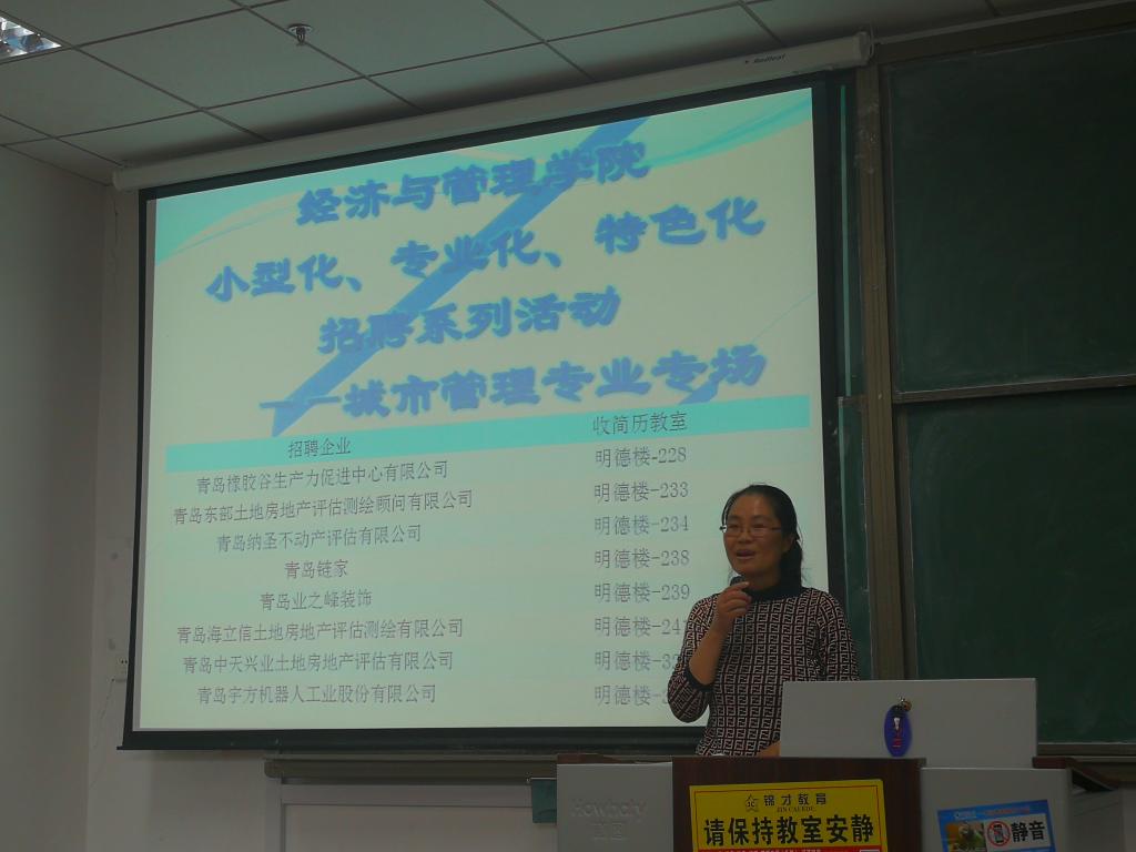 本场招聘会共邀请到青岛橡胶谷生产力促进中心有限公司,青岛东部土地房地产评估测绘顾问有限公司,青岛纳圣不动产评估有限公司,青岛链家,青岛业之峰装饰,青岛海立信土地房地产评估测绘有限公司,青岛中天兴业土地房地产评估有限公司,青岛宇方机器人工业股份有限公司8家企业。大会伊始,系主任宫攀致辞,对各企业的到来表示热烈欢迎,并对城市管理专业学生表达殷切期盼。各家企业对本公司的概况及人员需求进行了详细的介绍。参加此次招聘会的学生向企业投放个人简历,与相关企业负责人作进一步交谈。