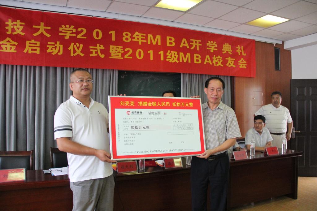 2011级MBA校友刘亮亮捐赠基金,张元利为他颁发捐赠证书。