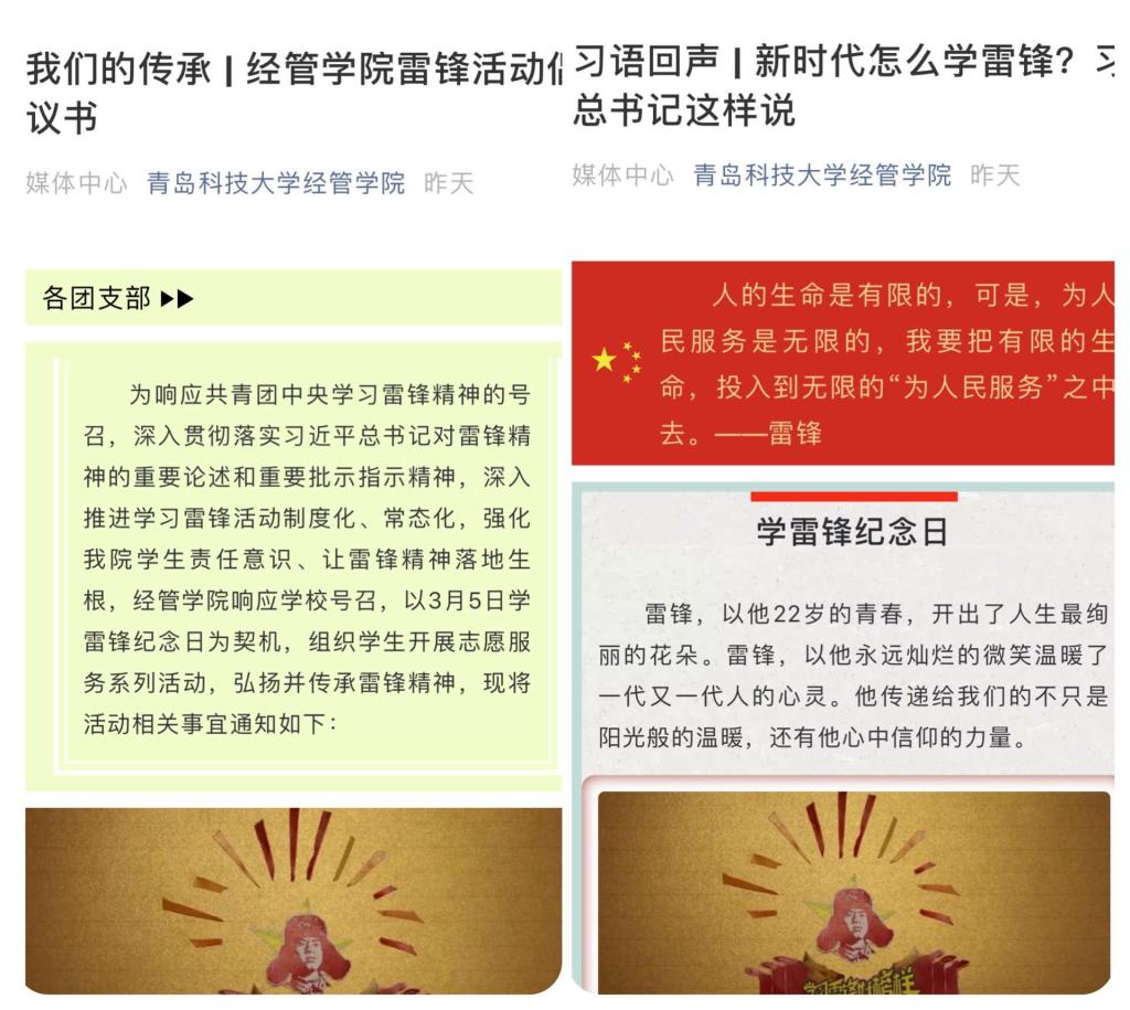 面向全体团员发出关于开展“传承弘扬雷锋精神 争做新时代雷锋传人”活动的倡议书,各年级团支部积极响应号召,以“人人学雷锋”——开展主题团课教育、“天天学雷锋”——开展主题实践活动、“时时有雷锋”——设立支部雷锋服务队三种形式续写雷锋故事,播撒雷锋火种,诠释了新时代新青年的新风尚。