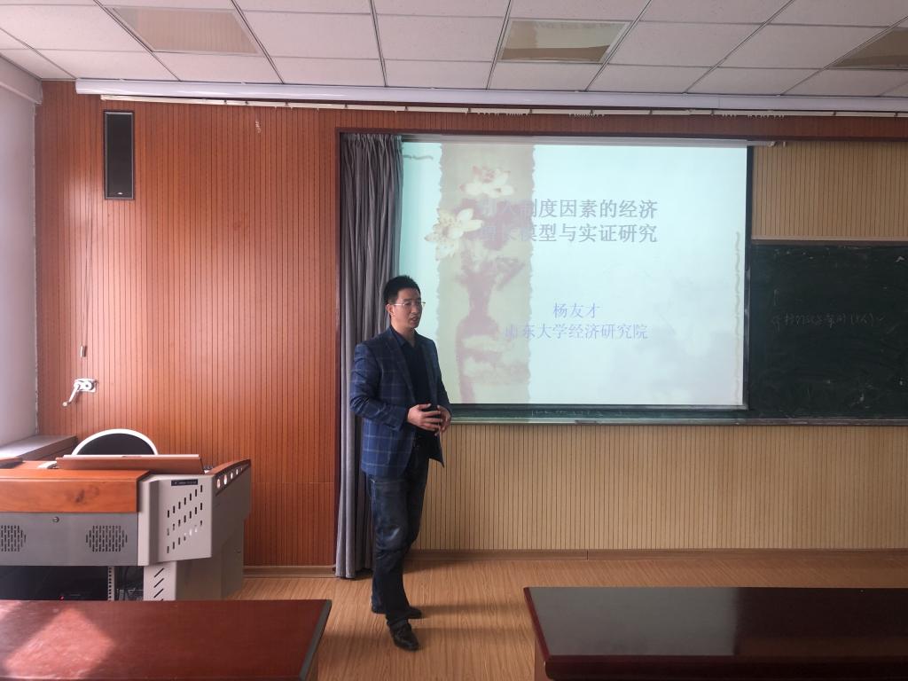 接着,杨友才教授与大家分享了题目为《引入制度因素的内生经济增长模型》的论文。该论文发表在权威杂志《学术月刊》(在综合类杂志排第二,仅次于《中国社会科学》)上。杨老师本次学术讲座的目的主要有两个方面:一是以该文章为例向同学们介绍如何规范地撰写数学模型类文章。首先是如何通过理论假设抽象的逻辑演绎构建经济数学模型。其次,如何对模型深入解读。如对模型均衡点存在性、稳定性和经济增长的平衡路径以及收敛速度的求解把数学逻辑严谨之美给以展示,其作用机制予以科学解读。这就令人信服地告诉大家经济学加入数学使得其科学性得到了充分保障和体现;二是,制度是决定经济长期增长的主要因素之一,中国供给侧改革的重点之一是通过各种制度改革推动技术进步,加快经济结构转型升级。杨院长的分享引起了同学们的强烈关注,老师、同学们与他积极互动,深入探讨论文的创新之处。