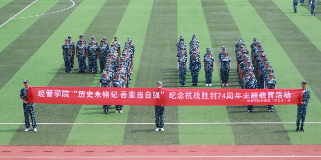 把思想引领教育放在首位,身着军训服的新生在操场上摆出“74”字样,纪念中国人民抗日战争胜利74周年。新生代表城管192班杨博表示“爱国主义始终在是亿万人民心中不变的旋律,也是广大青少年的必修课,我们要接力奋斗,把爱国主义的额热情转化为学习知识、报效祖国的不竭动力,在奋斗中书写无悔人生。”