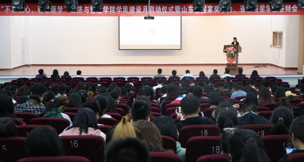 举行了山东省国家奖学金、省政府奖学金答辩会。城管161班杨宝杰、国贸161班陈永洁、财务161班秦晓芳、物流162班陈锐、营销172班肖映彤、国贸171班王熙媛、工业171班岳玲玲、城管172班姜延杰、管理171班戚金钰、城管171班姜名圻、工业182班赵宜政、物流182班彭承琪等12名候选学生依次上台从个人经历、学习情况等各方面全方位进行了个人风采展示。