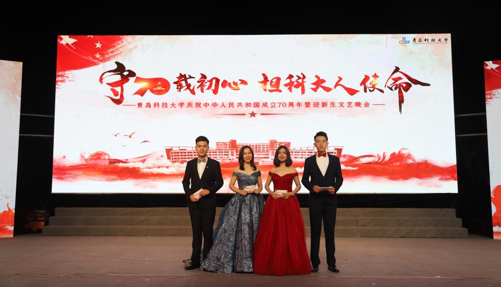 庆70华诞,谱科大新篇。在举国上下欢庆中华人民共和国成立70周年之际,为表示对2019级新同学的到来,学校“守70载初心 担科大人使命”——庆祝中华人民共和国成立70周年暨迎新生文艺晚会于2019年10月16日晚6时30分在崂山校区南苑运动场隆重举行。晚会分为“守初心庆华诞”、“担使命颂科大”两个篇章,我院师生代表参与的节目在晚会演出过程中大放异彩,倍受好评。