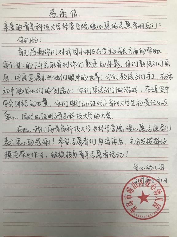 近日,青岛市崂山区爱心幼儿园给我院寄来了感谢信,对德州扑克俱乐部