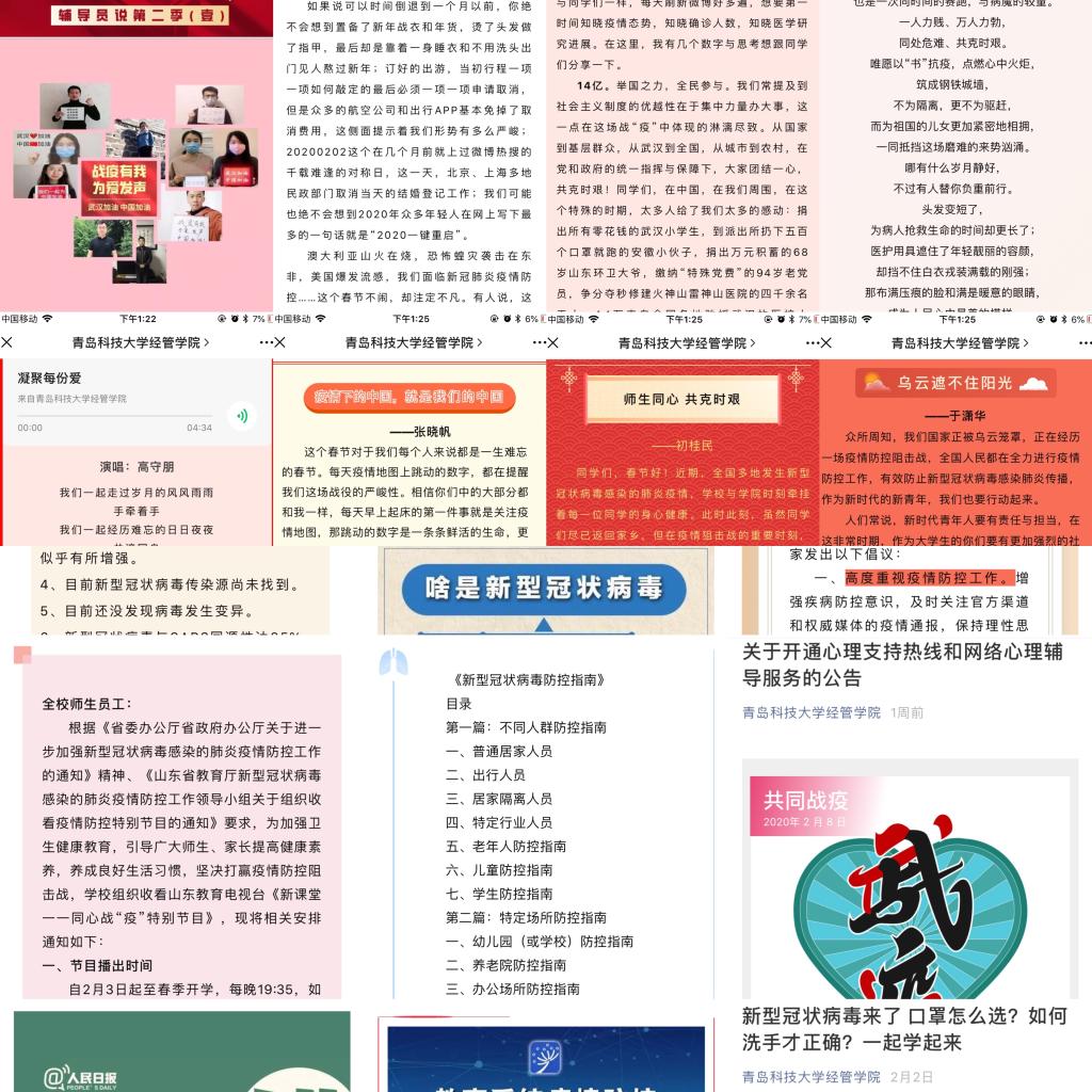 官网、微信官微、QQ公众号、易班等线上渠道,及时发布官方疫情防控信息和学校疫情防控最新通知要求,扎实推进正面舆情宣传;充分发挥党支部、团支部作用,开展 “同心同向 共克时艰”主题团日活动,涵盖德州扑克俱乐部