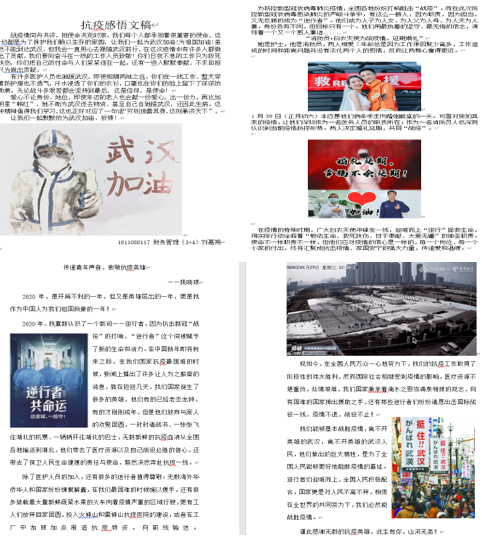 财务(3+4)161班、营销172班等班级组织同学以电子稿的形式书写团结互助、守护心灵的抗疫生活日常,分享自己在疫情期间的所见所闻、所思所想等,并将其整合分享,进行投票,评选出最为感人、积极向上的文稿。营销172班冯莹菲同学在她的“抗疫日记”中写道:“疫情终将过去,待春暖花开之时,我们一定会再次走出家门,看错过的风景,拥抱想抱的人,加油,我最亲爱的祖国!”